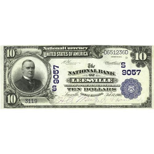 <B>Leesville, SC</B></I> - $10 1902 Plain Back Fr. 626 <B>The NB of Leesville</B></I> Ch. # (S)9057<BR>A beautiful note which is one of the very nicest examples we have had to offer from any South Carolina bank. This piece realized $1207 when last offered in our 2003 St. Louis Central States sale, and we expect an even higher realization tonight. <B>Choice About Uncirculated.</B></I>