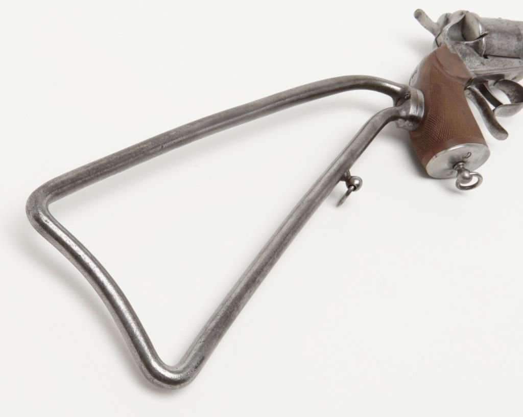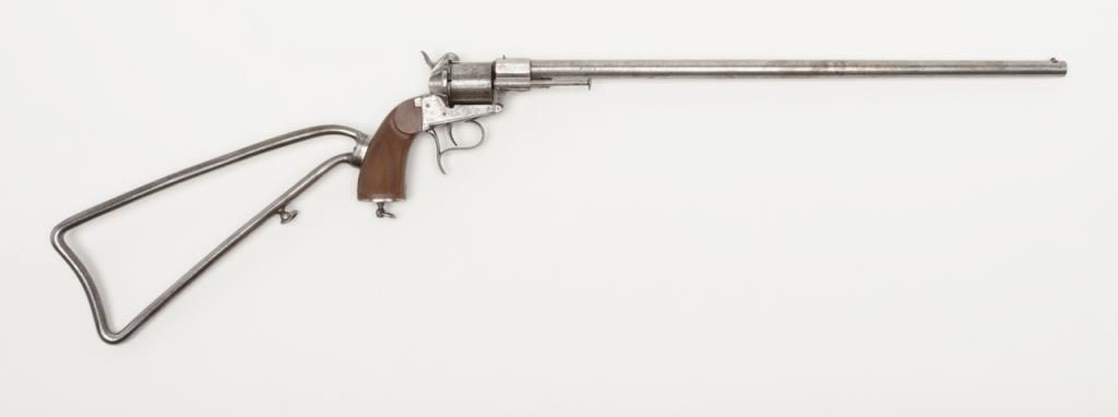 Lefaucheux Brevette single action pinfire pistol carbine with detachable shoulder stock in approximately 11 mm showing 21 ½” barrel and 38 ½” overall with stock attached. The barrel is engraved with dealers name “H Mangeot” and “A.Bruxelles”. The metal surfaces show a gray patina with some light cleaning and some moderate scattered erosion and pinprick pitting. The grips are well-made and checkered restorations. The stock is genuine to this revolver and the cylinder is marked “Cast steel”. The action works well. A giant pistol. Est.: $3000-$6000
