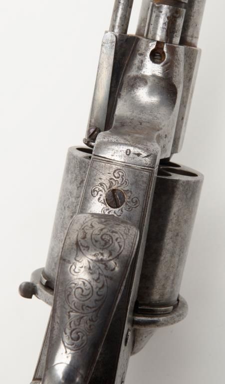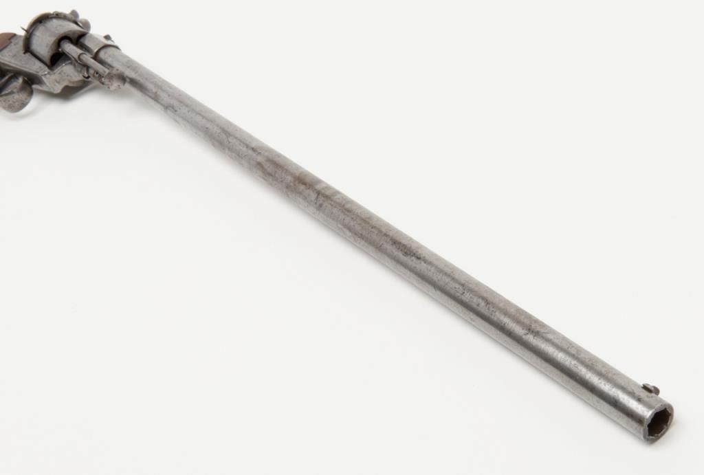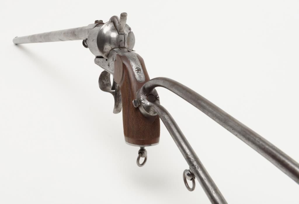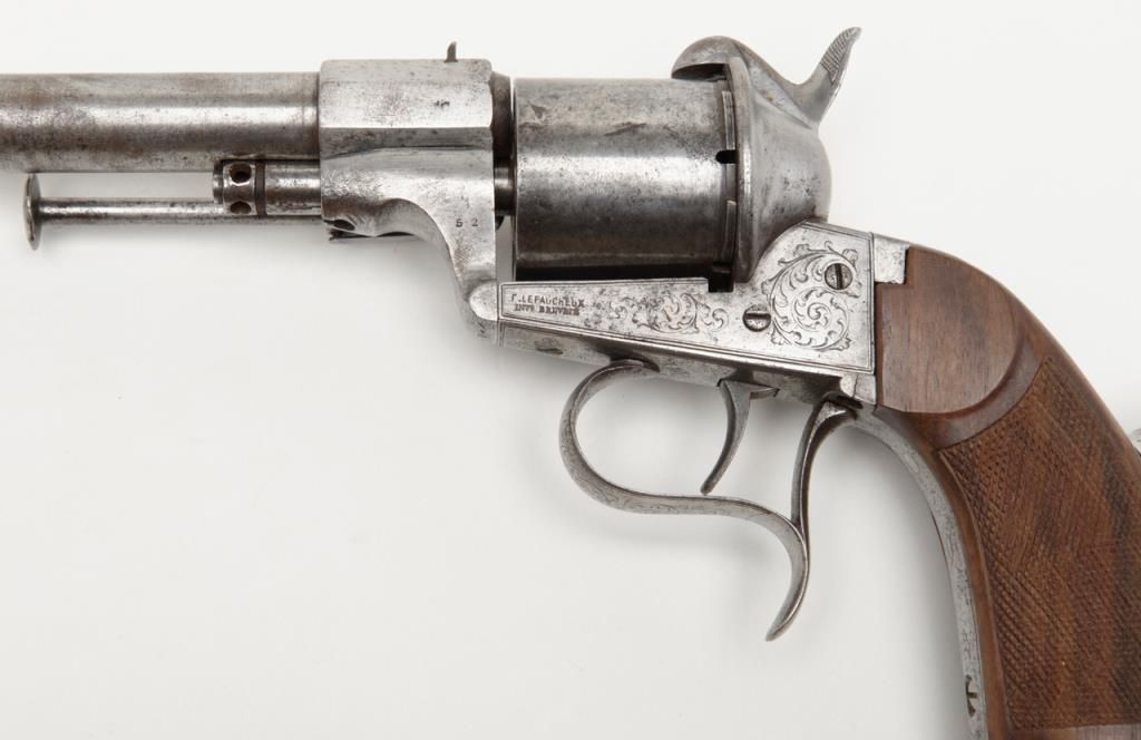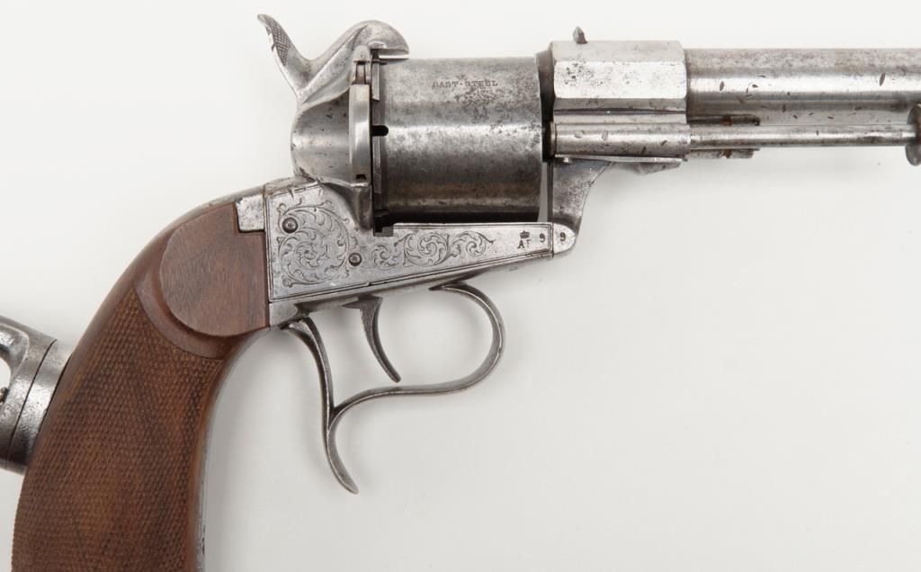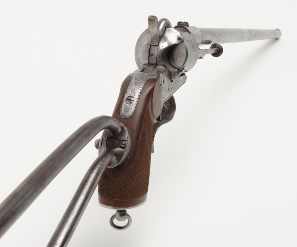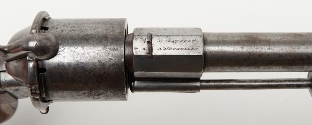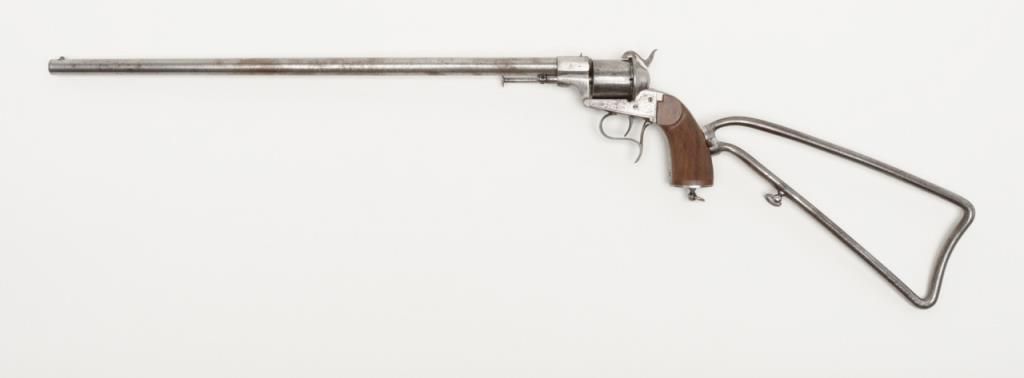 Lefaucheux Brevette single action pinfire pistol carbine with detachable shoulder stock in approximately 11 mm showing 21 ½” barrel and 38 ½” overall with stock attached. The barrel is engraved with dealers name “H Mangeot” and “A.Bruxelles”. The metal surfaces show a gray patina with some light cleaning and some moderate scattered erosion and pinprick pitting. The grips are well-made and checkered restorations. The stock is genuine to this revolver and the cylinder is marked “Cast steel”. The action works well. A giant pistol. Est.: $2500-$5000