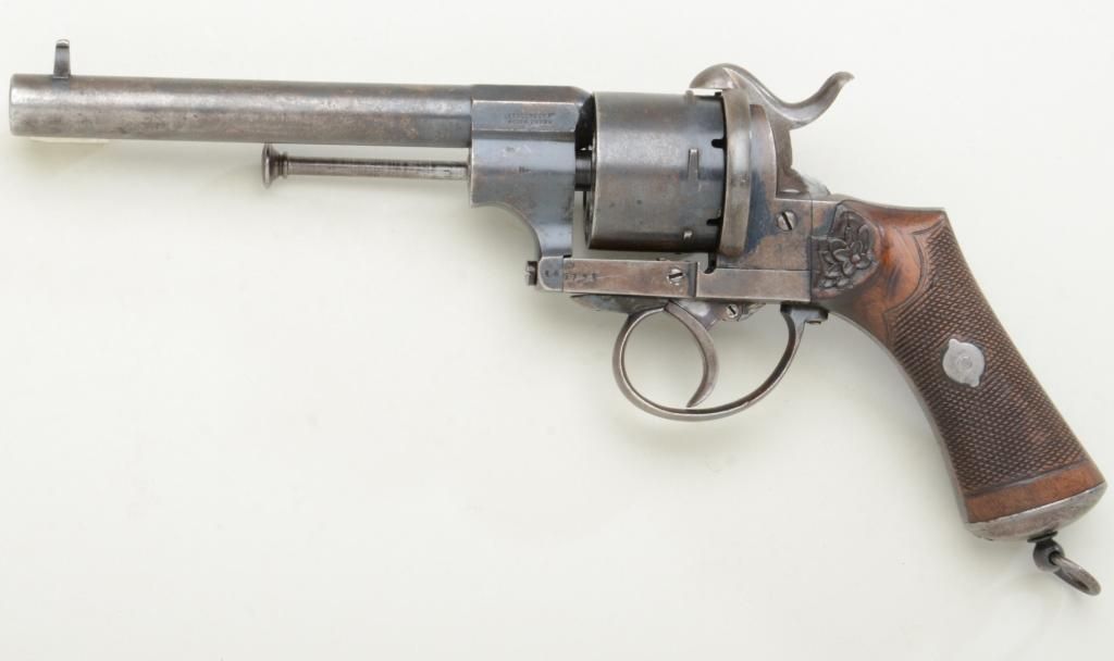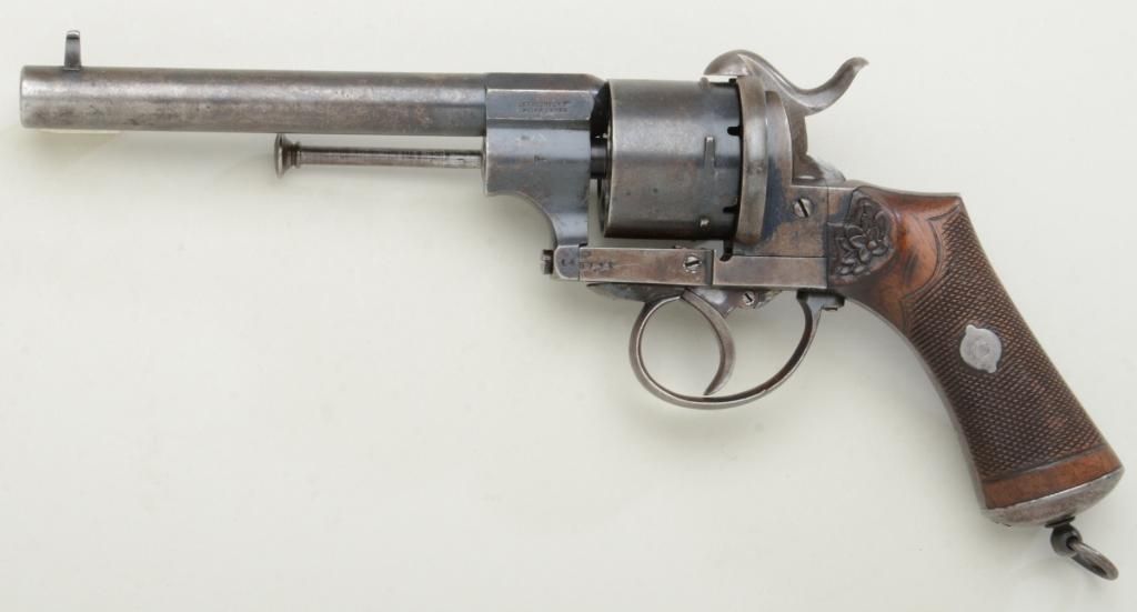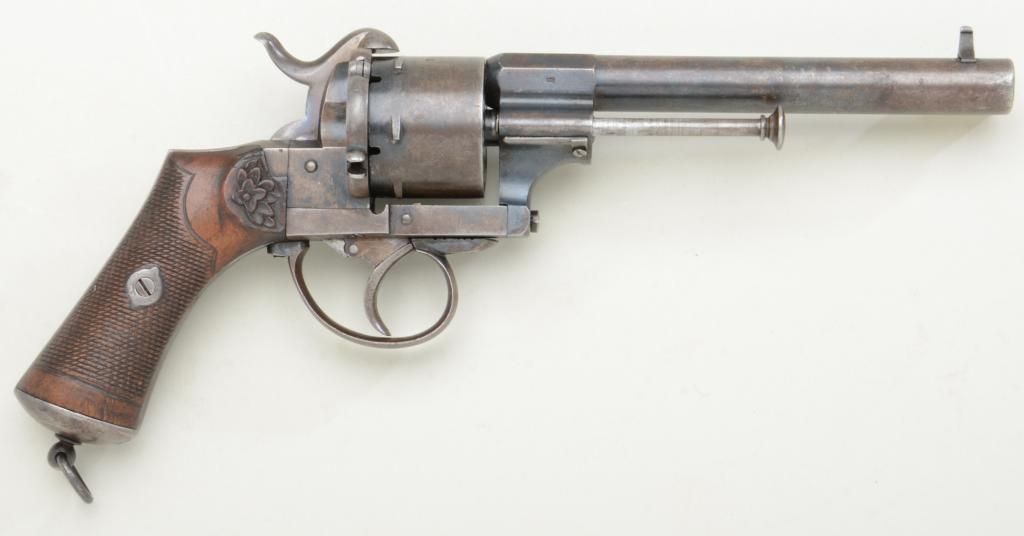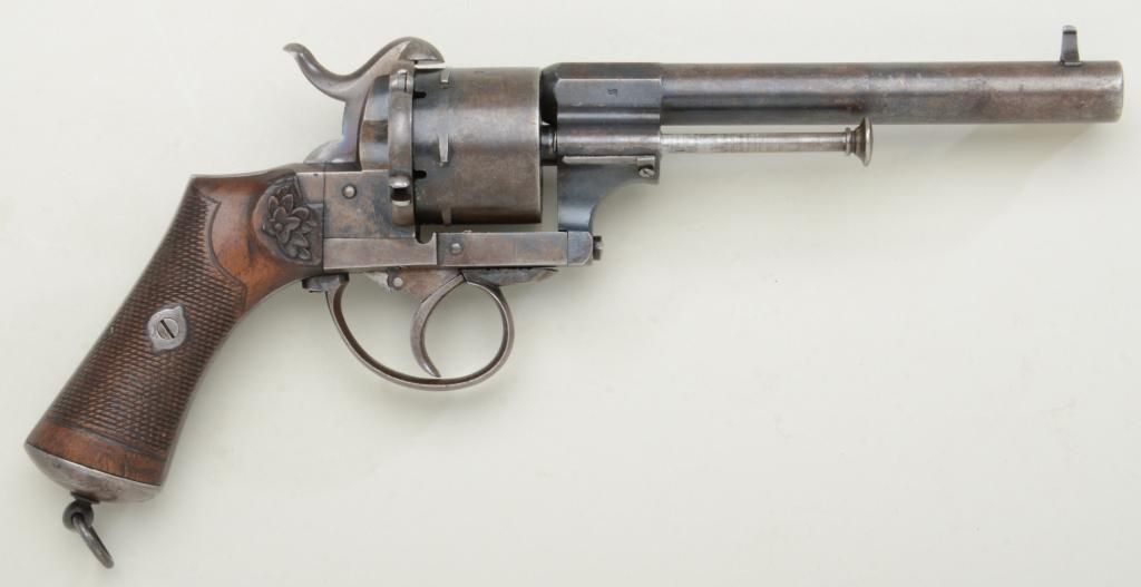 Lefaucheux marked double action large bore pinfire revolver with Belgian proofs, 6-shot cylinder, approximately 11.5mm, blued finish, checkered wood grips, serial #145791. The pistol remains in very good+ originalcondition showing 50-70% original blue; where flaked turning to patina with some light erosion and aging just starting. The grips are very good, the markings are sharp, the edges are crisp, the action tight, boreexcellent, circa about 1860s. Est.: $700-$1,400
