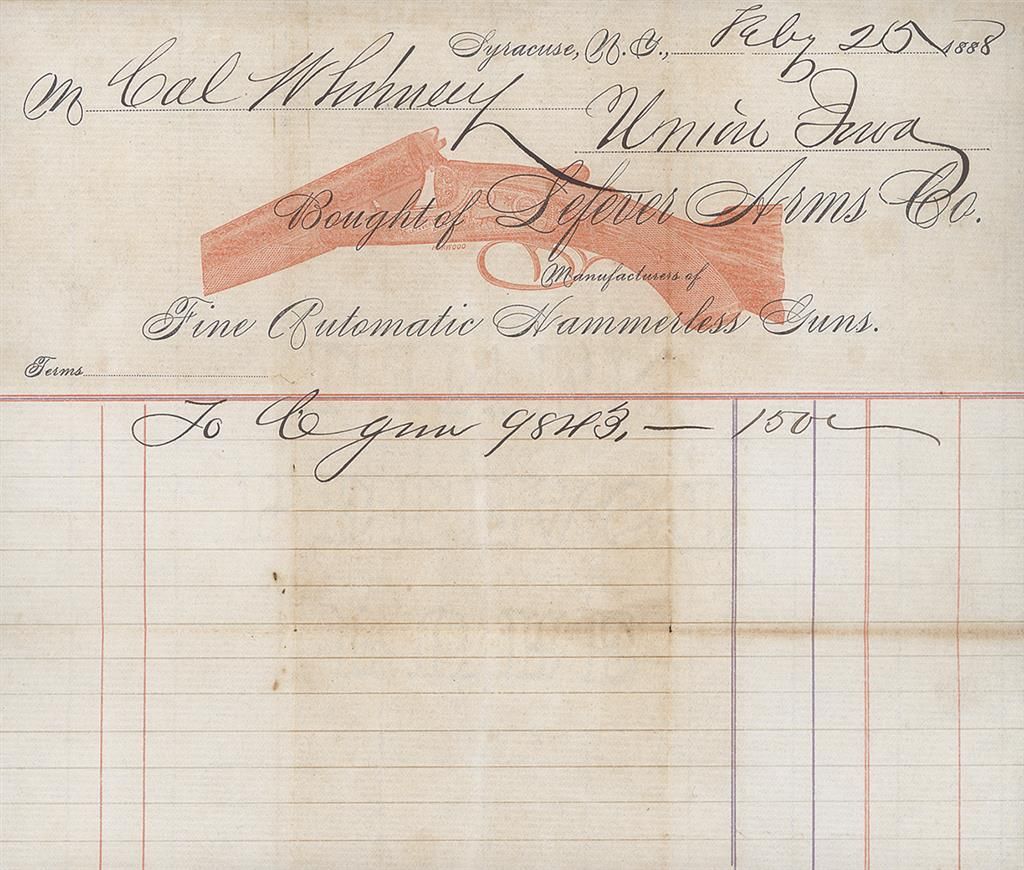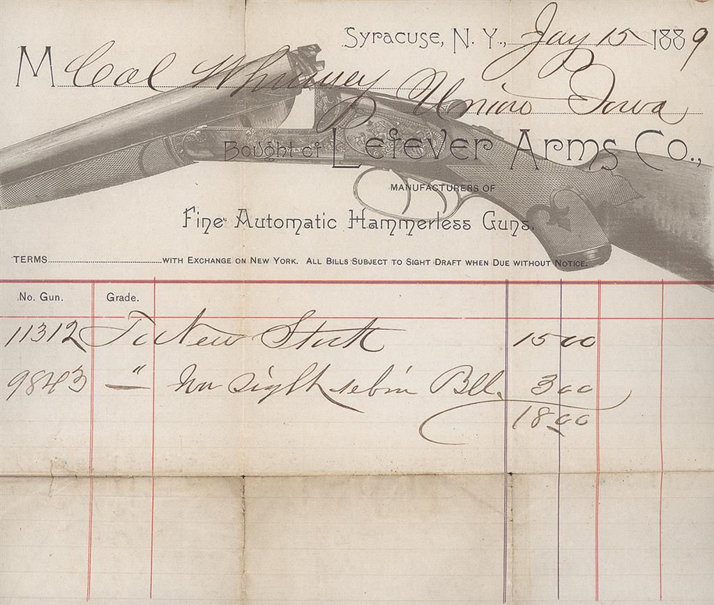 Modified/full chokes, 3" chambers, extractor, 13 1/4" LOP. With copies of Lefever Arms correspondence, including a bill of sale for this shotgun dated 20 Feb 1888.