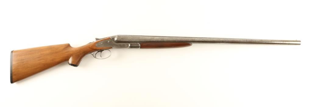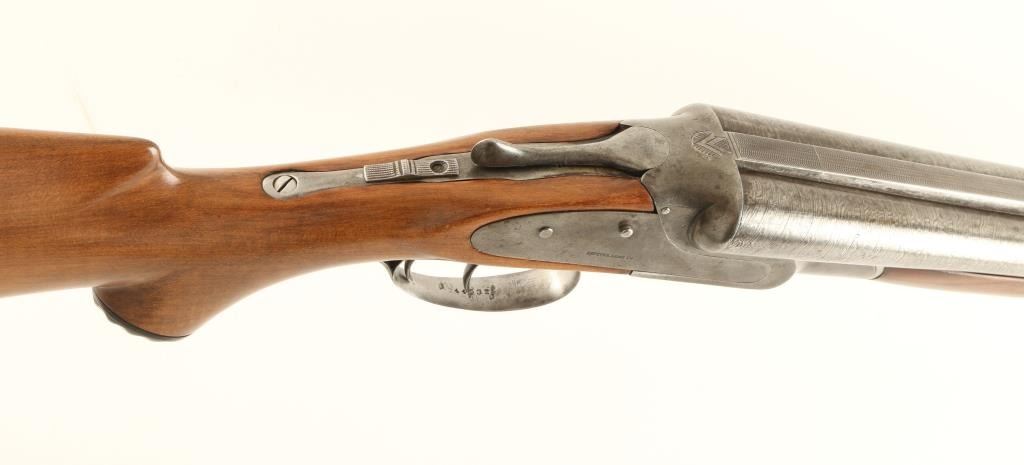 'HE Grade' Vintage American made double barrel sidelock hammerless shotgun chambered for 12 gauge shells, circa 1902. Features 28" damascus barrels with a raised solid rib, auto ejectors, brass bead front sight, double triggers, checkered top lever, sliding tang safety, smooth wood forend and pistol grip shoulder stock with factory buttplate. Barrels exhibit beautiful damascus patterns with a brown patina and receiver is in the white with greying patina and traces of a case hardened finish in protected areas. Action is crisp, bores are very good and stocks are fine. A very nice example of an early American hammerless shotgun. ***C&R Firearm*** ***Modern Firearm***