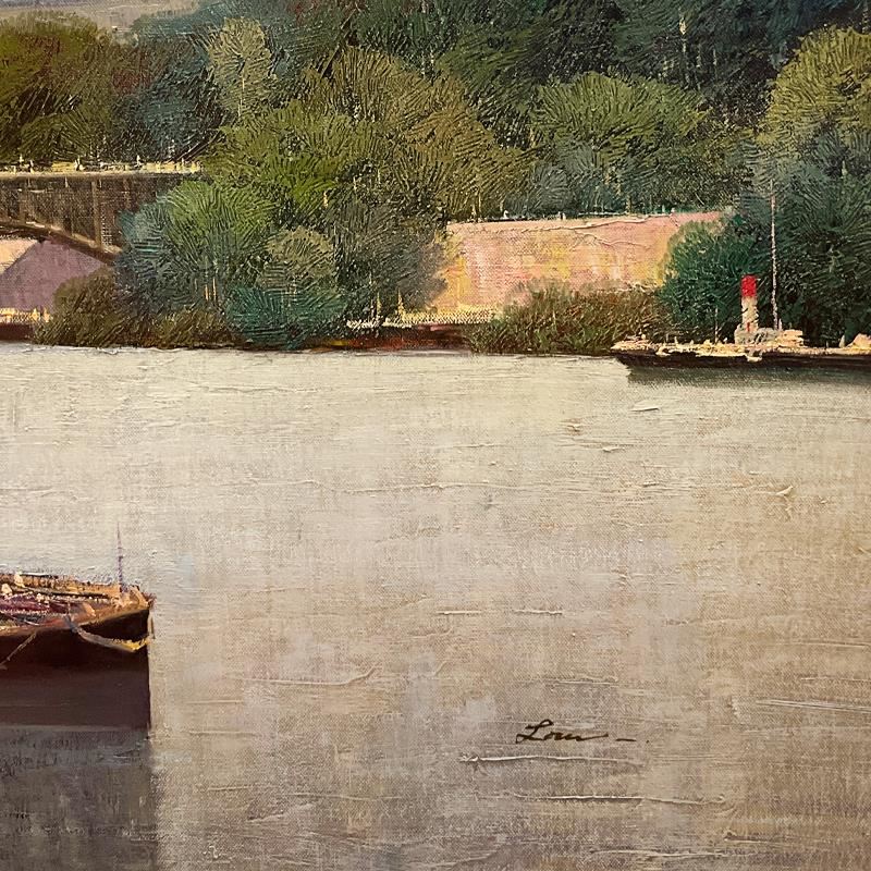 "Left Bank" is an original oil painting on stretched canvas by Law Kwok Keung, hand signed by the artist. This piece comes framed. Includes Letter of Authenticity. Measures approx. 42" x 52" (frame), 29.5" x 39" (image). There is minor chipping on the corners of the frame.