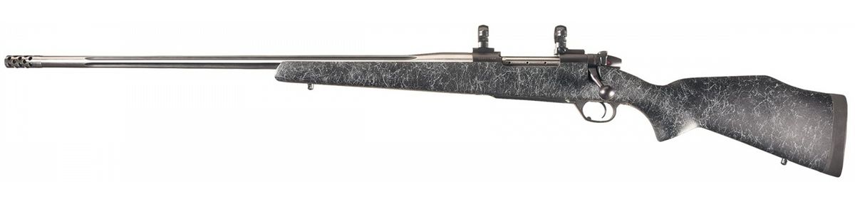 Manufactured in the U.S.A. with standard markings. Muzzle brake and a fluted stainless steel barrel without sights. Black oxide receiver tapped for scope mounts with a polished fluted bolt. Mounted on a synthetic Monte Carlo style stock with cheek pad, sling swivel studs and a solid rubber recoil pad. With scope mounts and mounted scope rings.