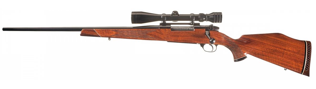 Standard markings and manufactured without sights. Polished fluted bolt and follower. Deluxe Monte Carlo style, skip-line checkered walnut pistol grip stock with a rosewood forend tip, rosewood grip cap with diamond insert, raised comb, cheekpiece, sling swivels and a vented rubber Weatherby recoil pad. Equipped with a Redfield 3-9x Scope.