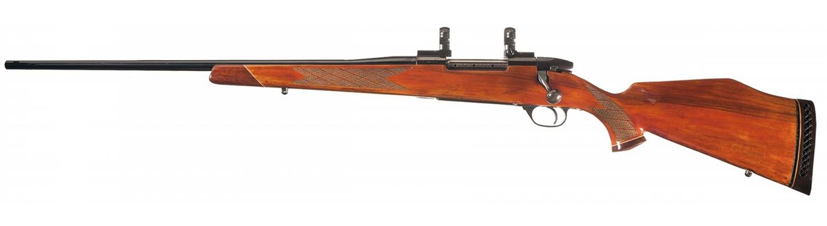 Standard markings and manufactured without sights. Ported barrel, polished fluted bolt and jeweled follower. Mounted on a Monte Carlo style, skip-line checkered walnut pistol grip stock with a rosewood forend tip, rosewood grip cap with diamond insert, raised comb, cheek piece, sling swivel studs and a vented rubber Weatherby recoil pad. With scope rings mounted.