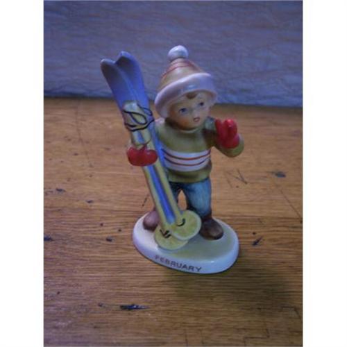 Adorable little boy with his skiis.Is the birthday figurine for February. 5 " high.Has been re-glued by the skiis(see photo)but still a darling figurine.
