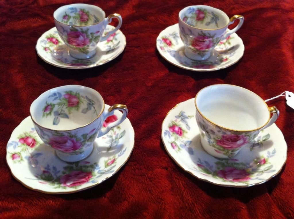 Lefton China Pink Rose, Hand Painted 8 piece Demitasse (4) teacups, (4) saucers. Please notice that one of the teacups you can feel texture close to the rim different. The same floral pattern is used on all pieces. All eight pieces are marked.