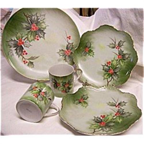 Festive in vivid holly green and berry red, this Lefton service set, though incomplete, will grace your Holiday table with color. Green hues graduate from color wash to deep green with a colorful impact of red in the berries.<BR><BR>Service consists of a smooth gilt edge Sandwich Plate, two scalloped gilt rimmed and bead detailed cake plates and two hot chocolate/cider mugs. The cake plates are pierced with two holes on the base in back for display hanging if one should desire to do so.<BR><BR>Sandwich plate measures 10.75 inches; cake plates measure 7 7/8 inches and mugs are 3 inches high. All are in wonderful condition with one small paint slip on the rim of one cup. <BR><BR>Markings: Cake Plate has red and gold Lefton foil label and numbered XP-41; pastry plates are numbered XP-4A; Mugs are numbered XP-4H.