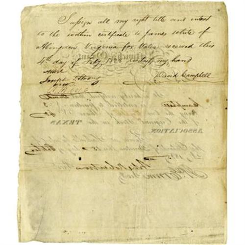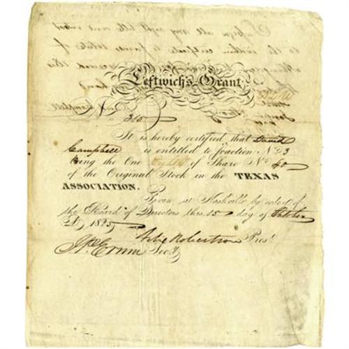 <B>Leftwich's Grant: Document Signed</B></I> "<I>Felix Robertson</B></I>" as President and "<I>J.P. Erwin</B></I>" as Secretary, one page, 8vo. Nashville, [Tennessee], October 15, 1825. Partly printed, completed in manuscript. In full, "<I>It is hereby certified that David Campbell is entitled to fraction No. 3 being the One Eighth of Share No. 40 of the Original Stock in the Texas Association. Given at Nashville by order of the Board of Directors.</B></I>" Manuscript Document Signed "<I>David Campbell</B></I>" on verso. In full, "<I>I assign all my right title and interest to the within certificate to James White of Abingdon Virginia for Value received this 4th day of Feby, 1828 witness my hand.</B></I>" In Nashville, Tennessee, on March 2, 1822, 70 individuals calling themselves the Texas Association addressed a petition to the newly independent government of Mexico, asking for permission to settle in Texas.<B> </B></I>Robert Leftwich, their most active member, personally brought the memorial to Mexico City, but it took him three years to get a colonization contract to bring 800 families to Coahuila and Texas. By that date, April 15, 1825, the money advanced to him by the Texas Association had run out, so he got the contract in his own name. Returning to Tennessee, on August 6, 1825, he sold his contract to the Texas Association, on condition that the area covered would thereafter be called "Leftwich's Grant." The contract gave permission to introduce colonists into an area covered by all or part of 17 present-day Texas counties: Bastrop, Bell, Brazos, Burleson, Burnet, Comanche, Coryell, Falls, Hamilton, Lampasas, Lee, Limestone, McLennan, Milam, Mills, Robertson, and Williamson. On October 15, 1827<B>,</B></I> Stephen F. Austin, acting as agent for the Texas Association, reviewed the original 1822 petition and translated it as "the Company from Nashville," so the government granted a confirmation in the name of "The Nashville Company," extending the area into present-day Bosque, Brown, Callahan, Eastland, Erath, Hill, Hood, Jack, Johnson, Palo Pinto, Parker, Somervell, and Stephens counties. In 1831, the area became known as the "Upper Colony" (1831-1834) and then the "Robertson Colony" (1834-1835). All the colonial land offices were closed by the Provisional Government of Texas on November 13, 1835. Following the Texas Revolution, the Robertson Colony was broken up to form the 30 counties mentioned above. Born in 1781, <B>Felix Robertson</B></I> was the first white male child to be born in what is now the city of Nashville. Mayor of Nashville (1818-1819), Robertson, as president of the Texas Association, led a party of 30 men to Texas to explore Leftwich's Grant in 1825. They explored the country along the Brazos, Little, Leon, Lampasas, Salado, and San Gabriel rivers, and on February 1, 1826, began surveying along Cow Bayou and the Brazos River. On his return to Tennessee, he again served as Mayor of Nashville (1826-1828). <B>John P. Erwin</B></I> was also a Mayor of Nashville (1821-1822, 1834-1835). Printed on thin paper, with slightly irregular but generally straight edges. There are folds and show-through from the assignment on verso. In fine condition. <I>From the collection of Darrel Brown. </B></I><BR><BR><B>Reference:</B></I> Streeter 1087<BR><BR><b>Shipping:</b> Flat Material, Small (<a target="_blank" href="http://www.heritageauctions.com/common/shipping.php">view shipping information</a>)