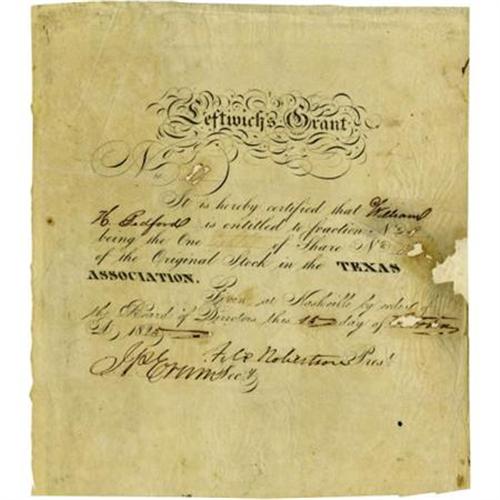 <B>Leftwich's Grant: Document Signed</B></I> "<I>Felix Robertson</B></I>" as President and "<I>J.P. Erwin</B></I>" as Secretary, one page, 8" x 8.5". Nashville, [Tennessee], October 15, 1825. Partly printed, completed in manuscript. In full, "<I>It is hereby certified that William H. Bedford is entitled to fraction No._ being the One Eighth of Share No._ of the Original Stock in the Texas Association. Given at Nashville by order of the Board of Directors.</B></I>" Blind embossed seal at lower center. Very fragile, with irregular marks; minor ink burn affects a few words. With expert restoration to verso. Overall, in good condition. <I>From the collection of Darrel Brown.</B></I><BR><BR><B>Reference:</B></I> Streeter 1087<BR><BR><b>Shipping:</b> Flat Material, Small (<a target="_blank" href="http://www.heritageauctions.com/common/shipping.php">view shipping information</a>)