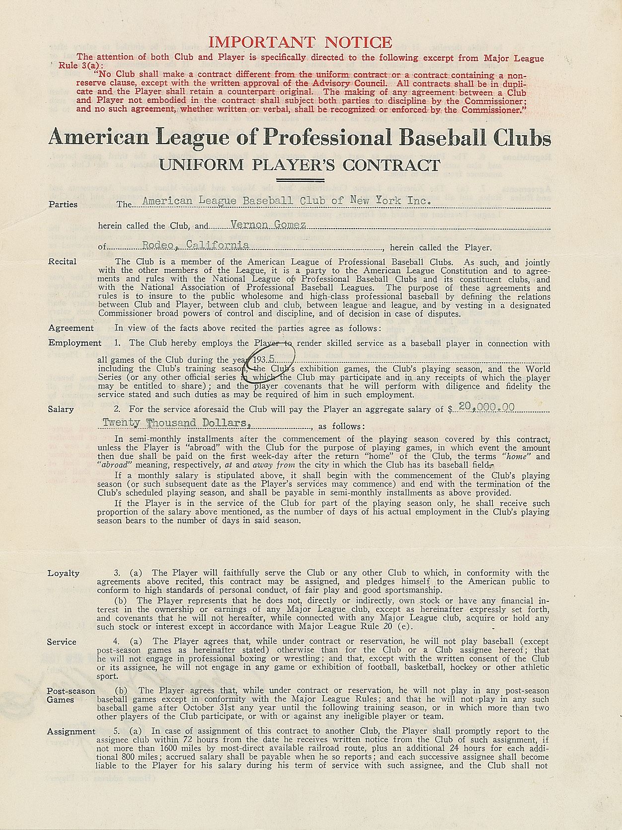 Contract, signed “Vernon Gomez,” four pages on two adjoining sheets, 8.5 x 11, March 2, 1935. American League uniform player's contract in which Lefty Gomez agrees to render "skilled service as a baseball player in connection with all games of the Club during the year 1935" for the New York Yankees, for a salary of $20,000. Signed at the conclusion in fountain pen by Gomez, and countersigned by Yankees Owner Jacob Ruppert. The reverse is signed by American League President William Harridge. In fine condition, with trivial creasing.