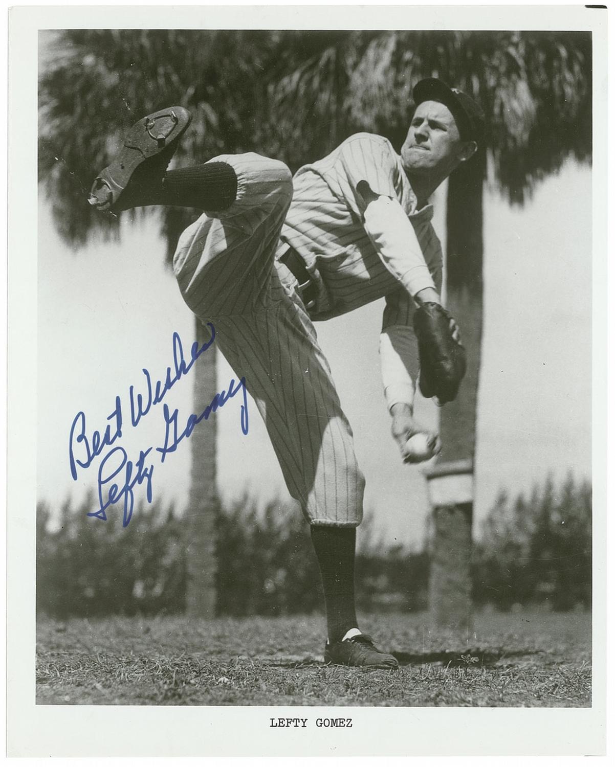 Glossy 8 x 10 photo of the Hall of Famer warming up at spring training, signed in blue felt tip “Best Wishes, Lefty Gomez.” In fine condition, with some light creasing and surface streaks.