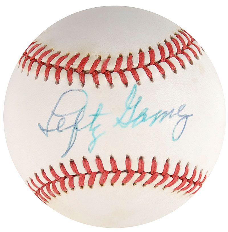 Official Rawlings American League baseball signed in blue ballpoint on the sweet spot. Some irregular discoloration to the center of the signature and a JSA label affixed to the reverse (certificate of authenticity not present), otherwise fine condition.