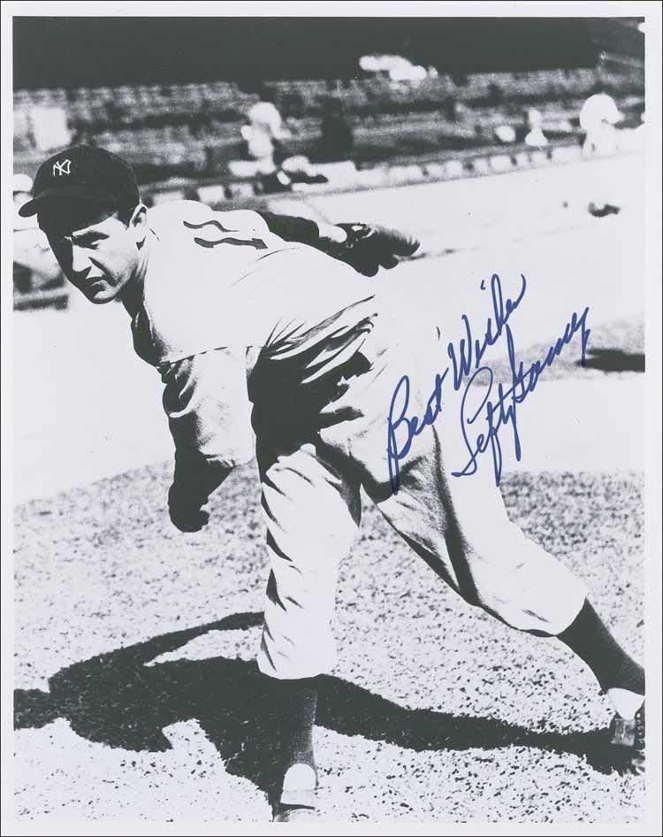 Glossy 8 x 10 photo of Gomez warming up before a game, signed in blue felt tip, “Best wishes, Lefty Gomez.” In very fine condition. Pre-certified Steve Grad/PSA/DNA and RRAuction COA.