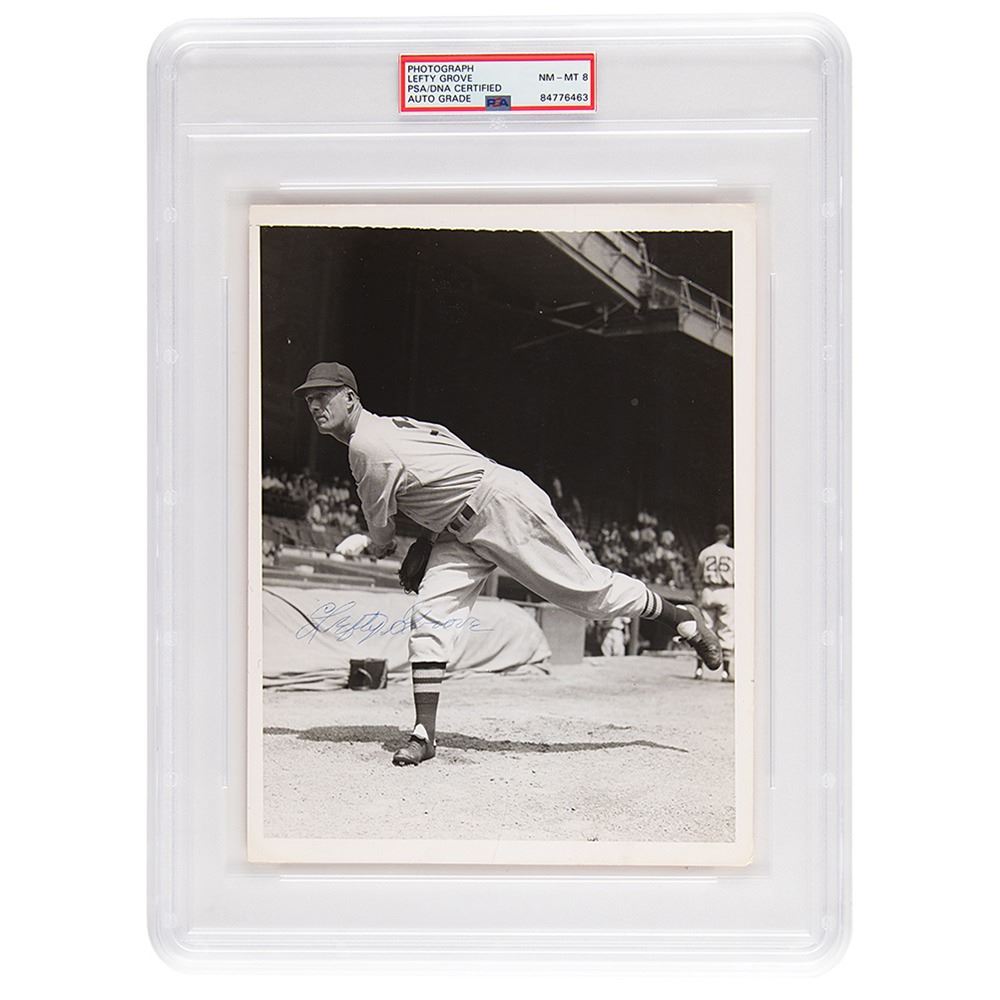Glossy 7 x 9 full-length photo of Lefty Grove after delivering a pitch in his Philadelphia Athletics uniform, signed in ballpoint. In very good to fine condition, with scattered light creasing and surface impressions. Encapsulated and graded by PSA/DNA as "NM-MT 8."