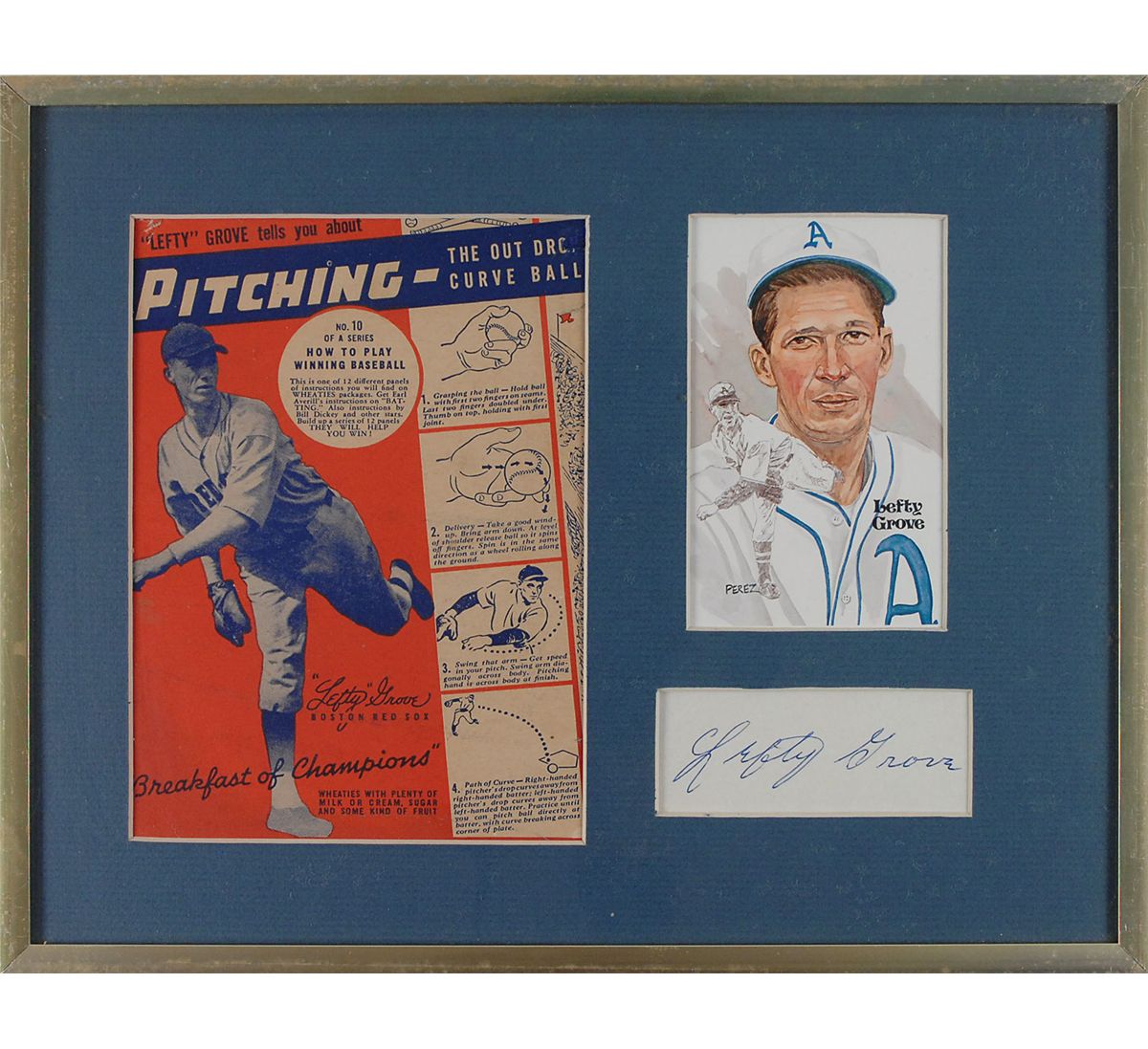 Ballpoint signature, “Lefty Grove,” on an off-white 4 x 1.5 card. Matted and framed with an original 1936 Wheaties box panel and a Perez-Steele card to an overall size of 14.5 x 11.5. In fine condition.