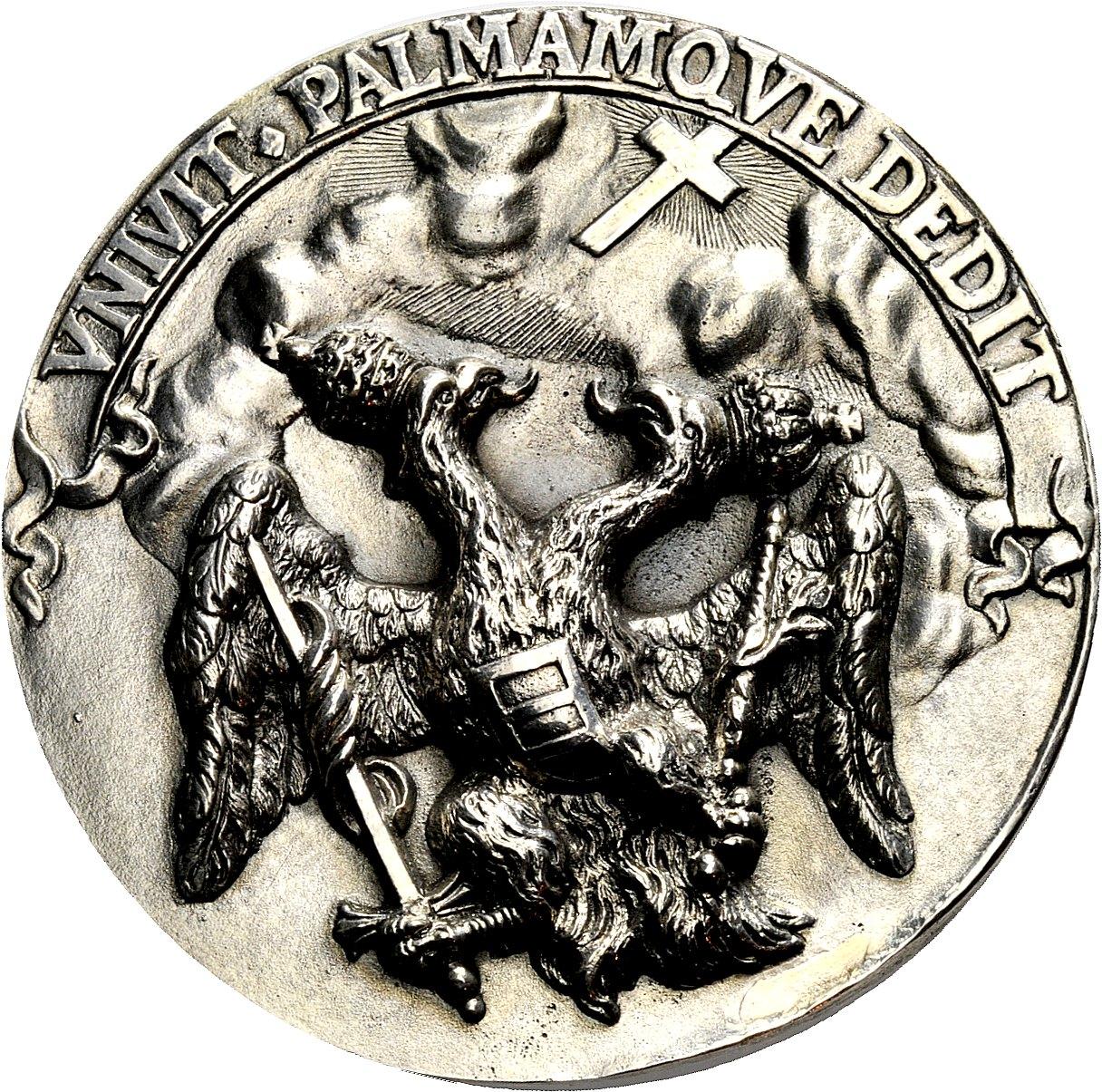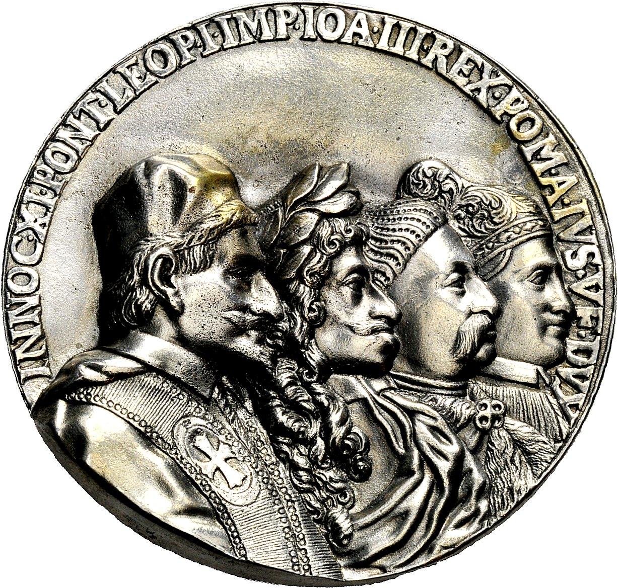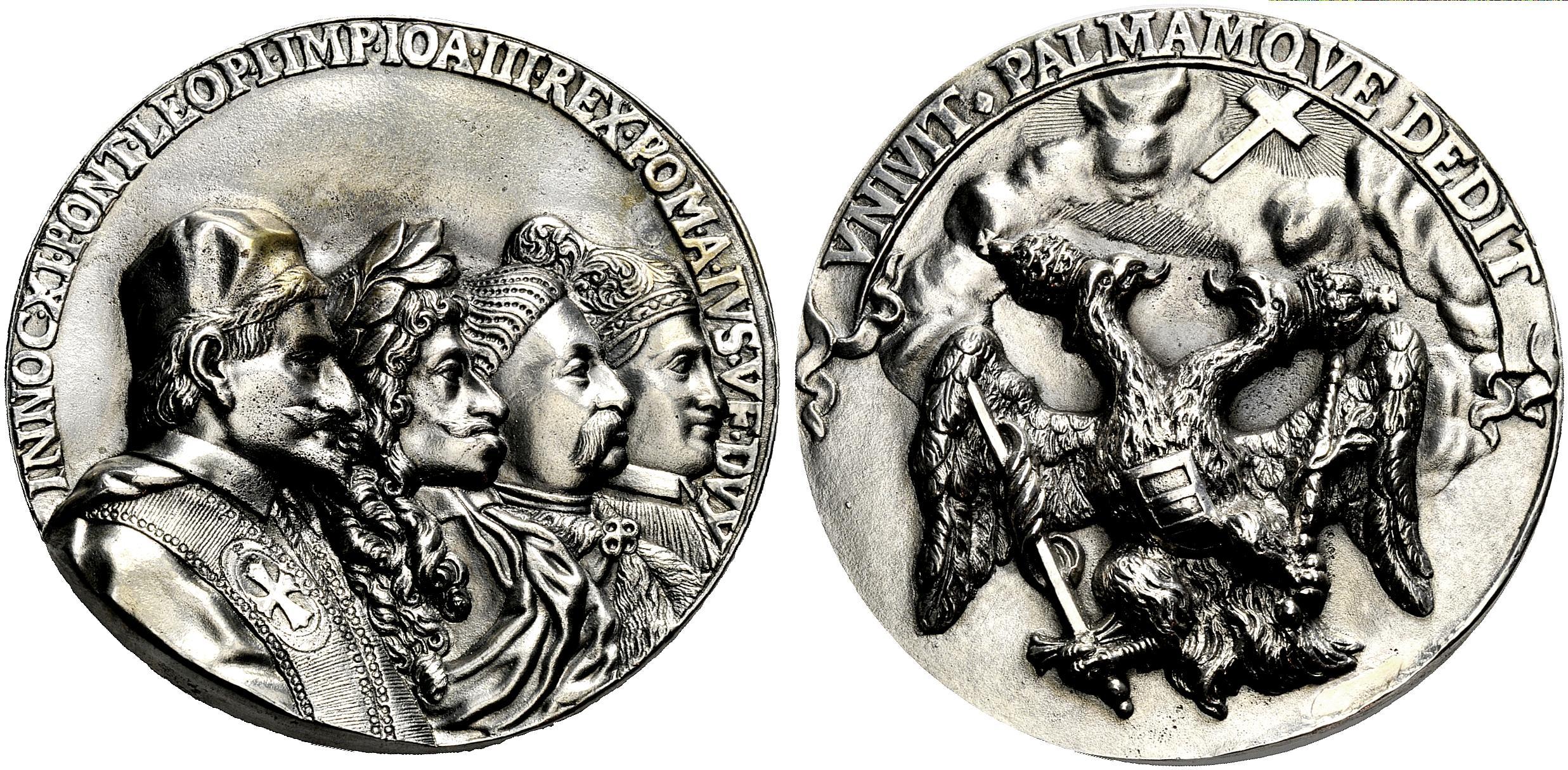 Medaglie e placchette. Lega Santa contro i turchi. Medaglia (1684). per la costituzione della lega Santa contro i turchi (opus: Johann Ignaz. Bendl), fusione in argento 204.99g. Ø 78,5 mm. INNOC XI PONT LEOP I IMP IO III REX PO M A IVS VE DVX Busti accollati a d. di Innocenzo XI, Leopoldo I d’Austria, Giovanni III di Polonia e Marc’Antonio Giustiniani. Rv. VNIVIT PALMAMQVE DEDIT Aquila bicipite ad ali spiegate, con triregno e corona imperiale, caricata dello scudetto austriaco, volge lo sguardo verso la croce raggiante in alto, tra le nuvole. Voltolina II/1035. Estremamente rara. Fusione originale. Spl