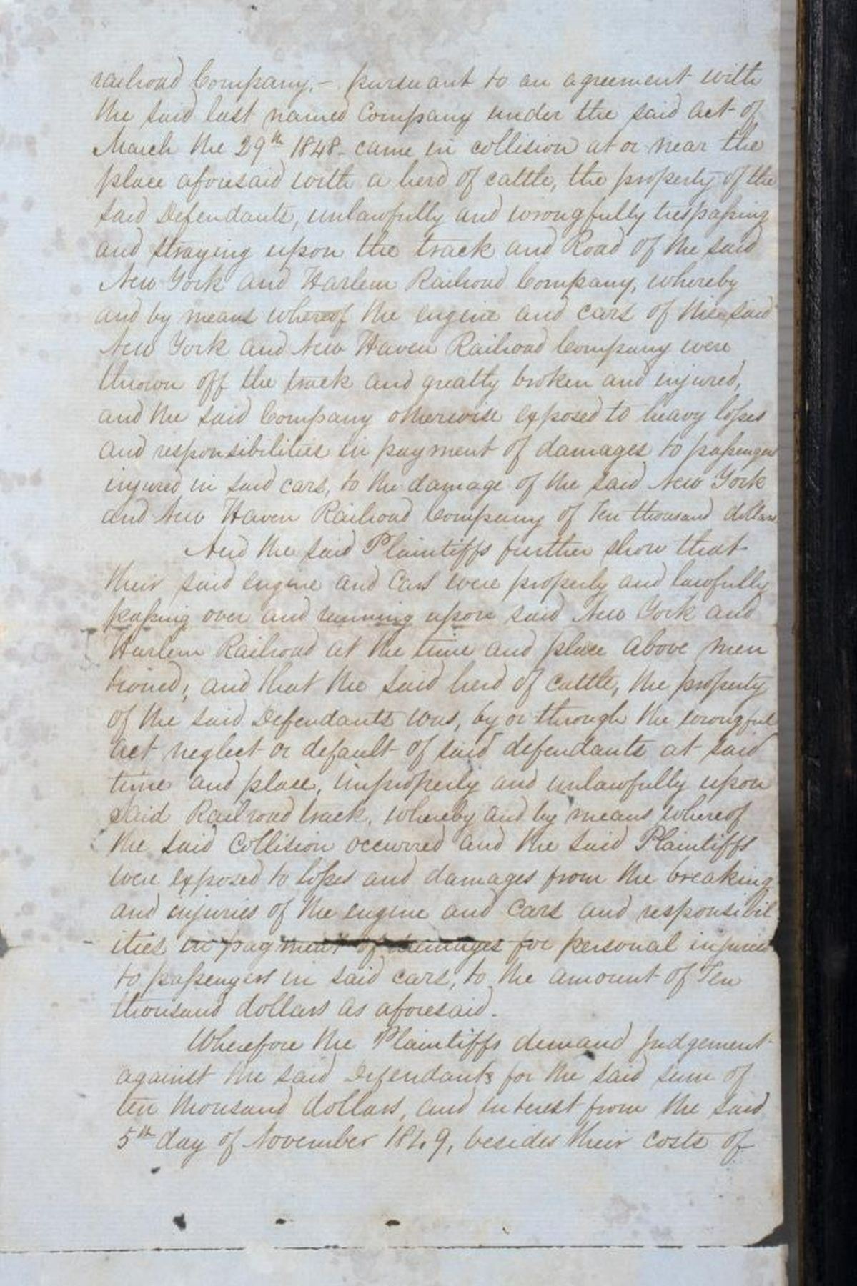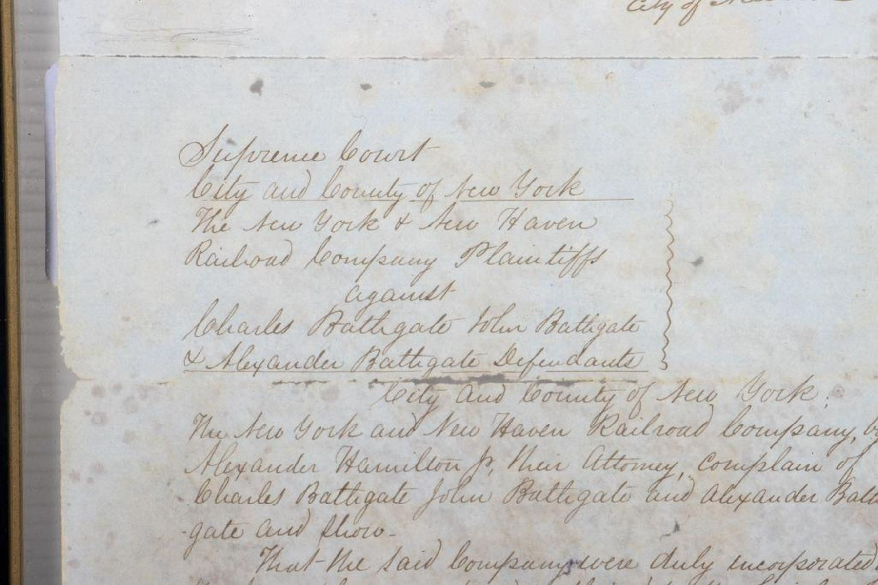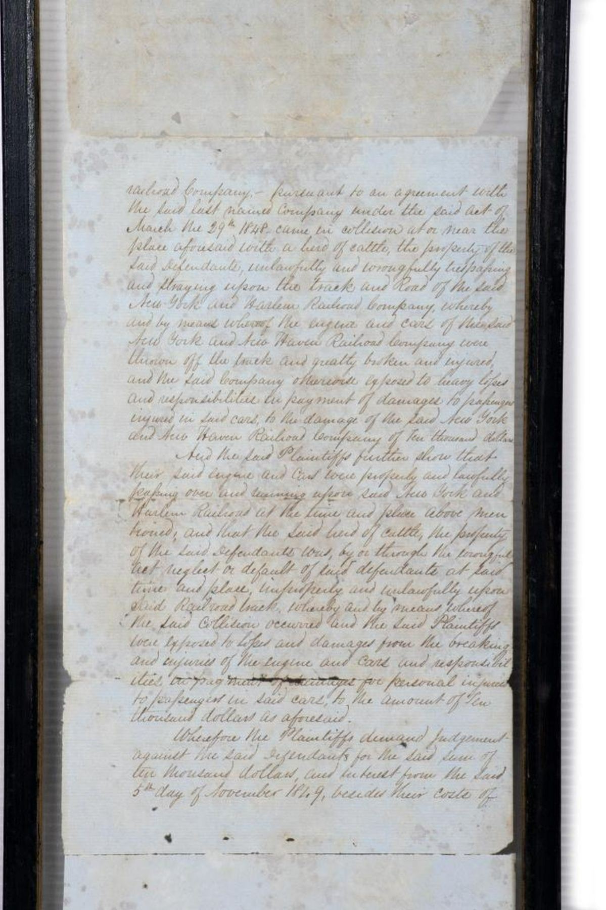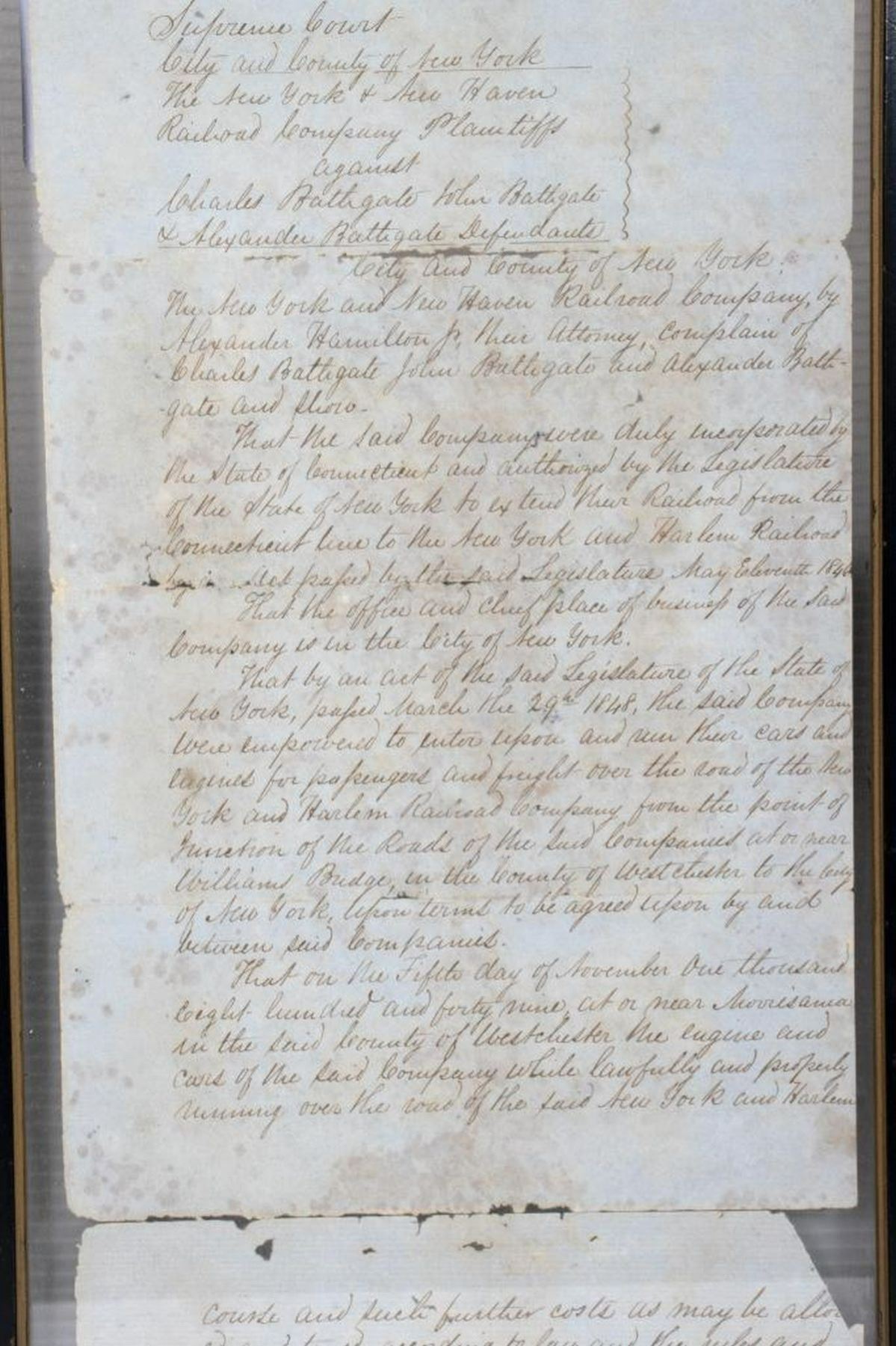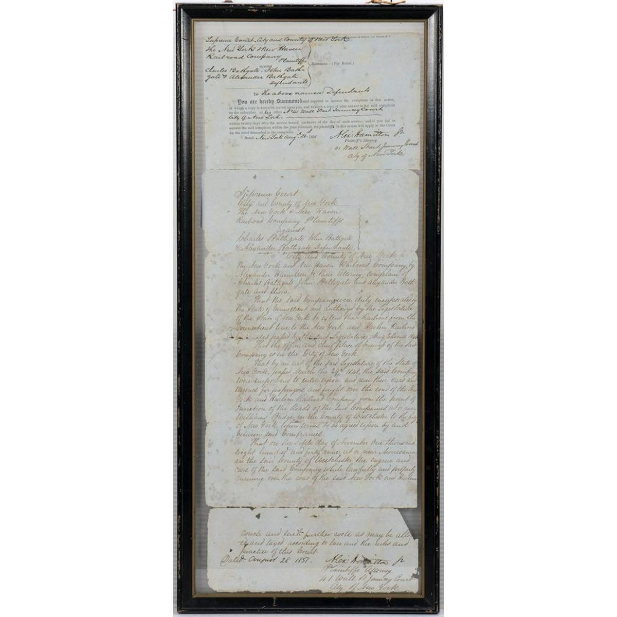 HAMILTON, ALEXANDER, JR. 1816-1889. A legal summons signed by the second son of American Founding Father, Alexander Hamilton, for a case at the Chancery Court, City of New York, August 28, 1851. The summons is for Defendants Charles Bathgate, John Bathgate, and Alexander Bathgate. Hamilton Jr. represents the Plaintiffs, The New York New Haven Railroad Company. The case concerns an accident that took place November 5, 1849, at a junction in Westchester County, where a herd of cows belonging to the Bathgates strayed onto the tracks and caused the engine and cars "...to be thrown off the track and greatly broken and injured." The Plaintiffs are requesting $10,000 in damages. The document has text on both sides, and measures in total 21 3/8" x 8", with tears and separations at the folds; it is currently framed between glass (frame 23 1/4" x 10"). Condition is overall fair to good, the text clear and readable, but with the noted tears and separations. Additionally, there are small holes on at least three of the paper segments, including at Hamilton Jr.'s signature.