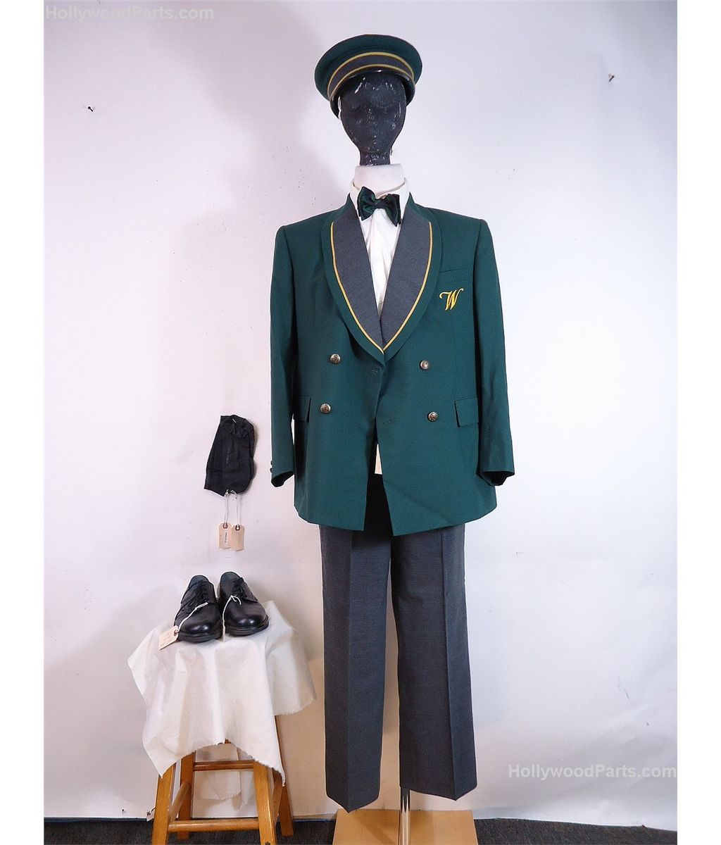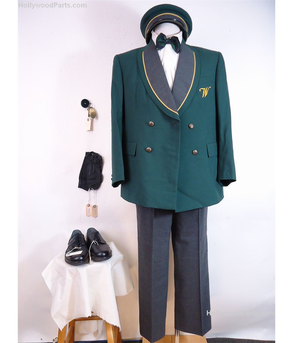 Custom made hero outfit worn by Bob Newhart in Legally Blonde 2. Costume consists of custom made forest green gold button double breasted blazer embroidered with gold "W" size 41, tech white long-sleeve shirt, pair of charcoal grey flat front pants inscribed "B. Newhart", black leather belt with square gold buckle, pair of Mephisto black leather lace up shoes, pair of grey socks and gold and green striped doorman's hat. Seen in outfit at the Wellington and while talking to Elle. Scenes 26-35-38, 40, 44.