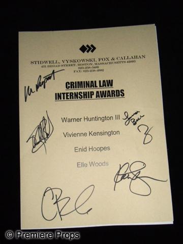 Legally Blonde - An original prop from the Broadway musical. A Criminal Law Internship Award signed by the cast, including Laura Bell Bundy, who played Elle Woods. Obtained at the famous Broadway Cares Flea Market held annually in NYC. 8.5" x 11"