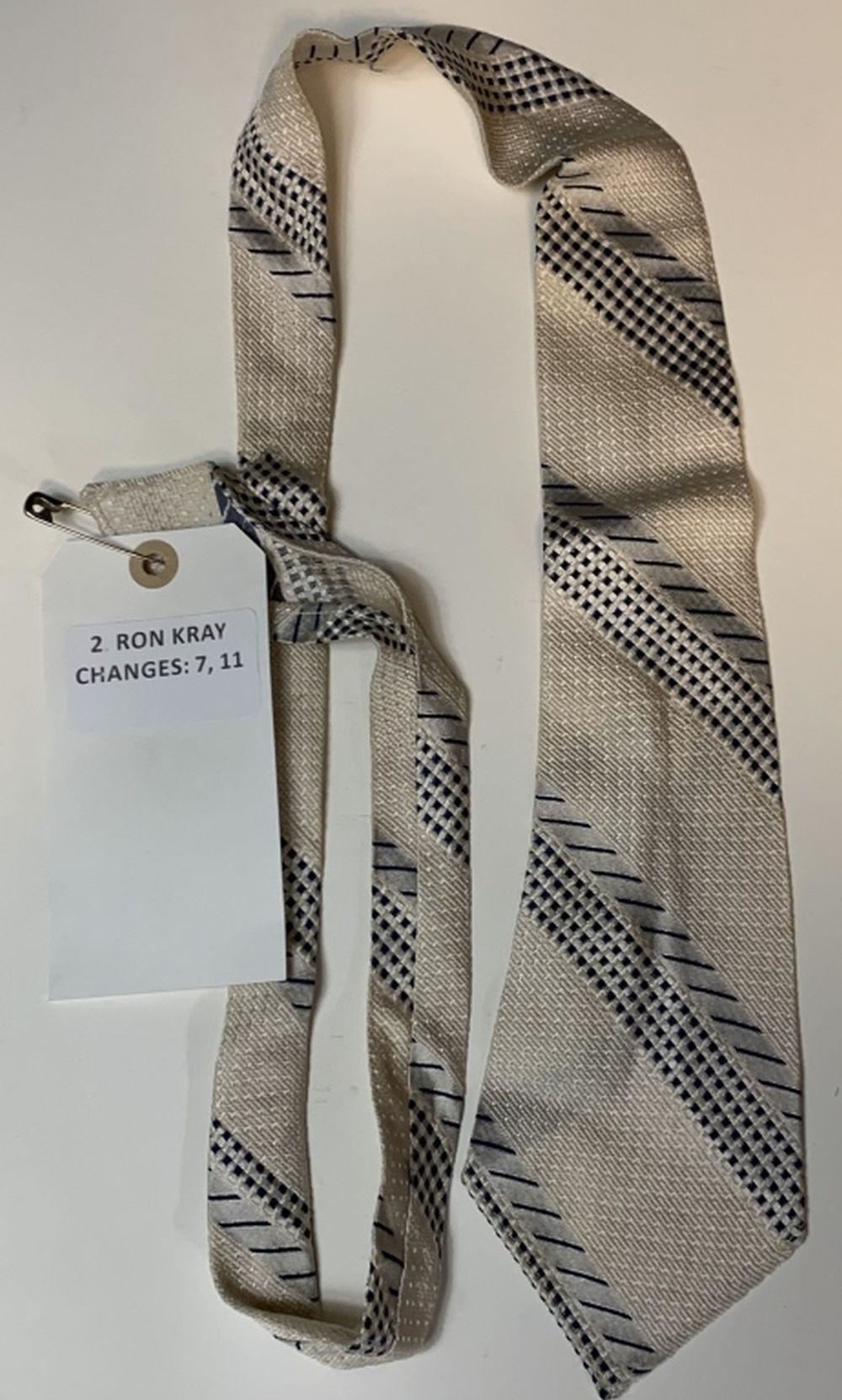 Original tie worn by "Ron Kray", played by Tom Hardy in the biographical crime thriller film "Legend"(2015). where, identical twin gangsters Ronald and Reginald Kray terrorize London during the 1960s.