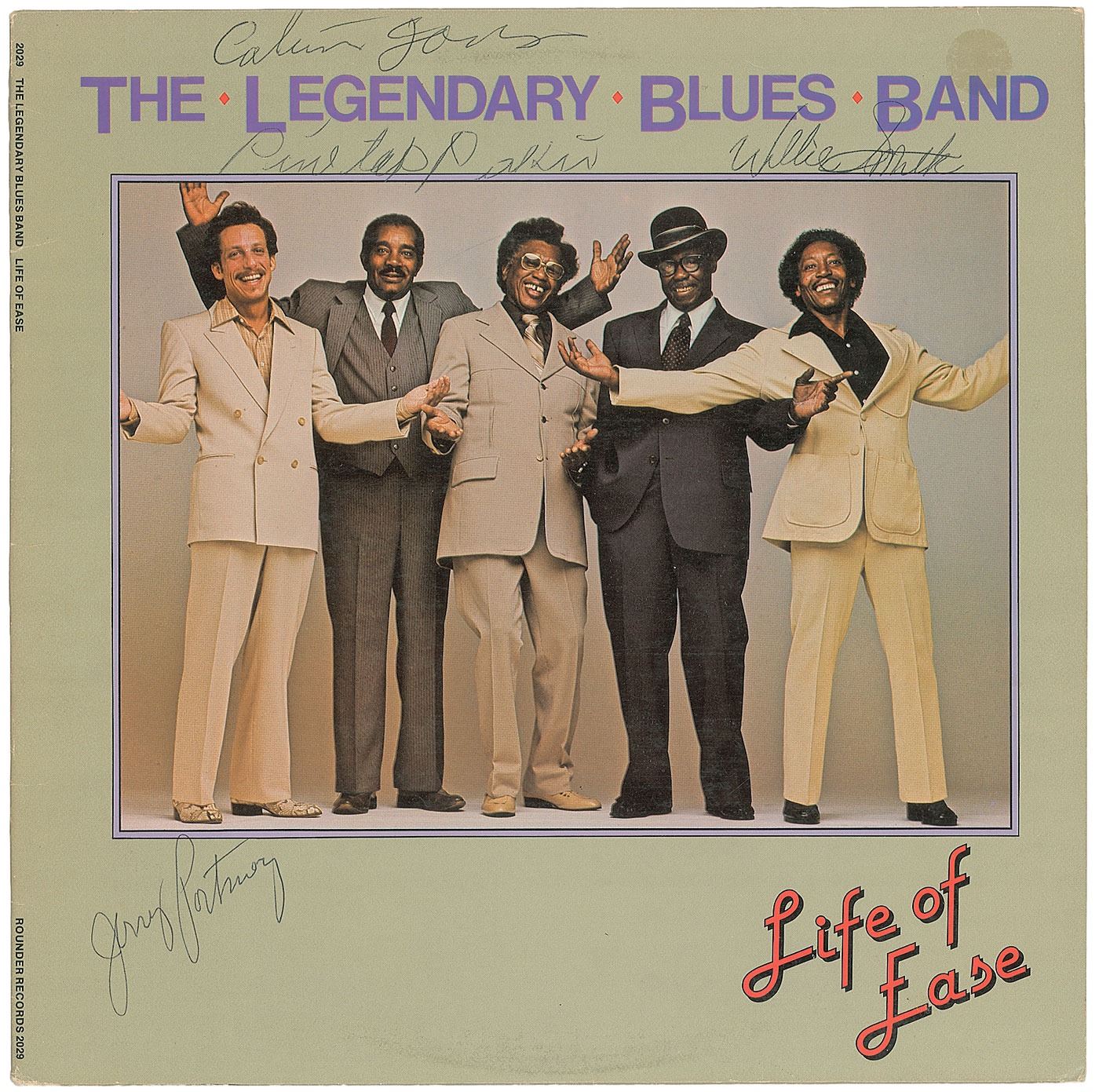 Life of Ease album signed on the front cover in black ballpoint by Pinetop Perkins, Willie Smith, Jerry Portnoy, and Calvin Jones. In fine condition, with a few light creases and a circular area of toning to the upper right from a previously affixed label. The record is included.