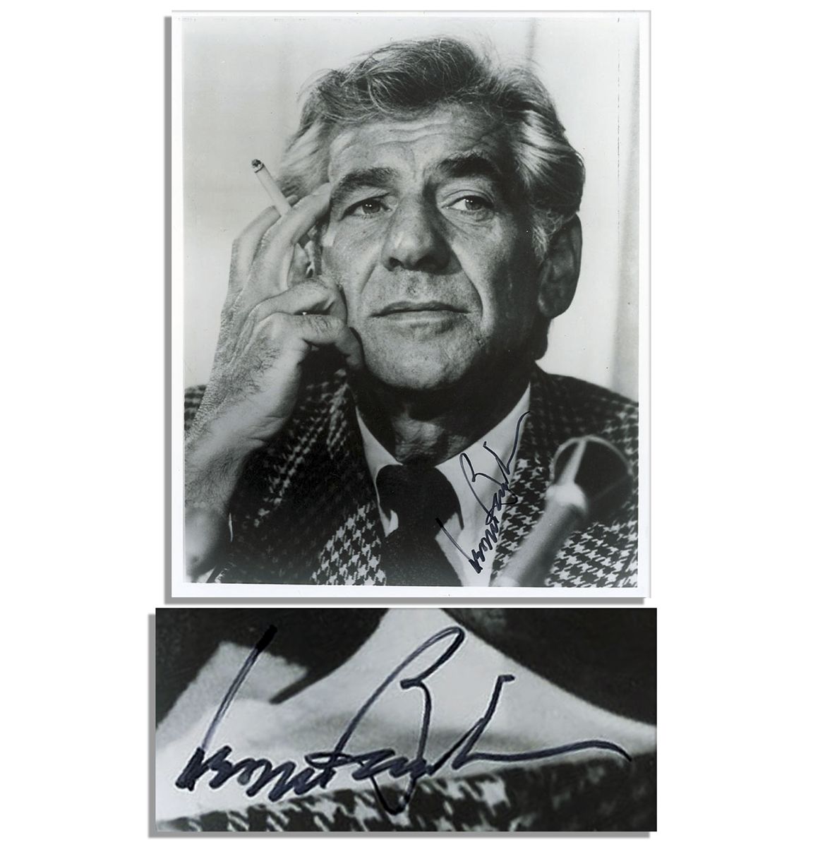 Leonard Bernstein signed 8'' x 10'' glossy photo. Here, the famed composer poses in a suit while holding a lit cigarette. Signed ''Leonard Bernstein'' vertically near his tie in black marker. Minor creasing and wear to top edge, else near fine.