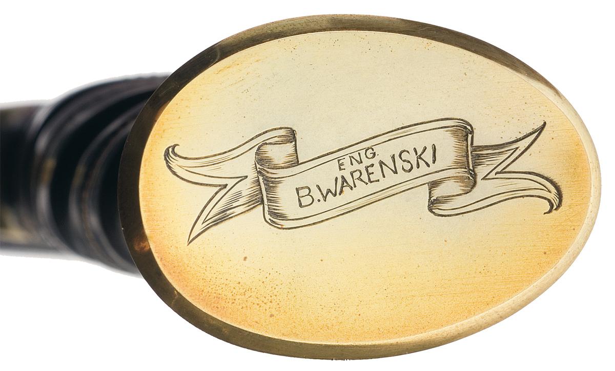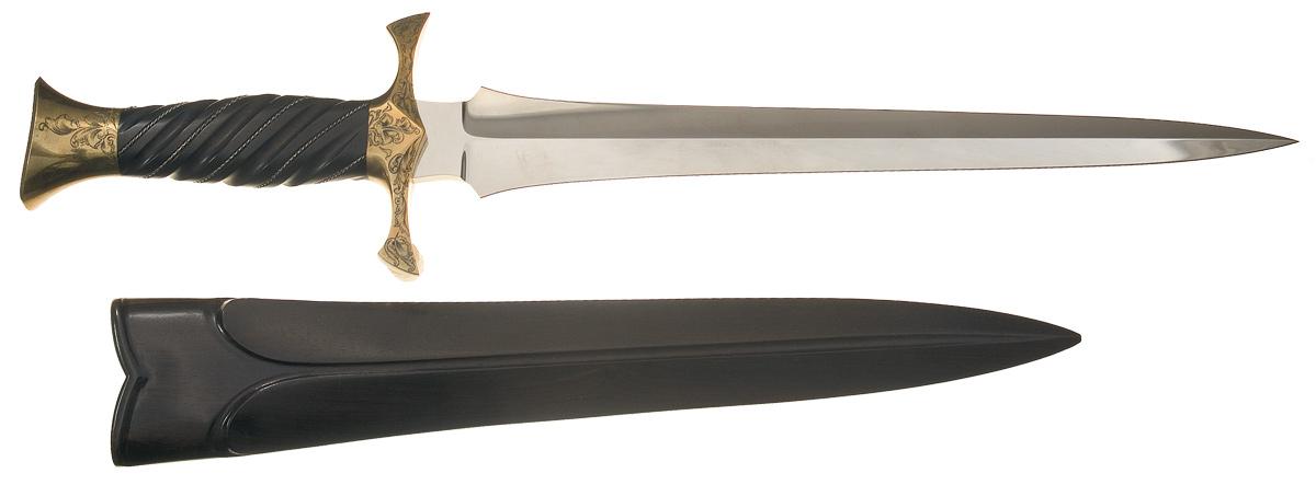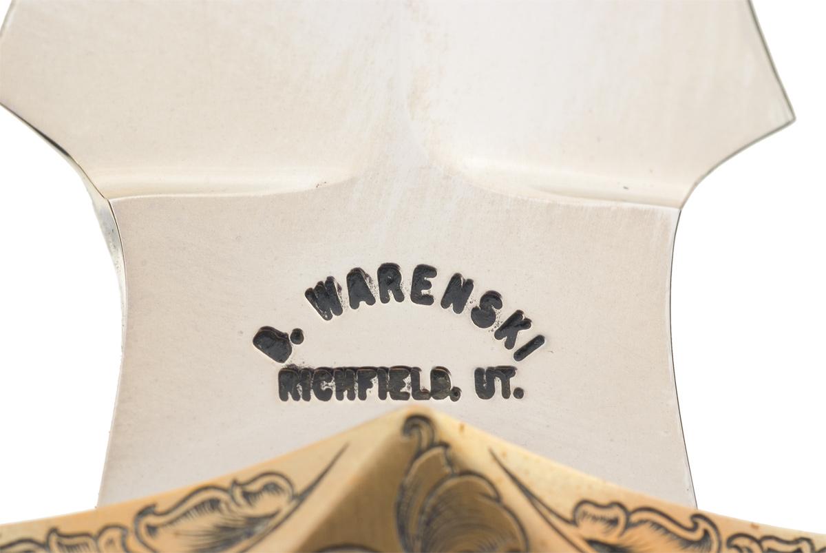 This is an example of a dagger handcrafted and engraved by Buster Warenski. For those in the custom knife making industry Buster Warenski needs no introduction. He was one of the greatest knifemakers of the last century, creating some of the most sought-after and most expensive knives in the world. Buster Warenski passed away on July 31, 2005. This Warenski dagger features an 11 inch blade marked "B. WARENSKI / RICHFIELD, UT." The brass guard and pommel are engraved with a floral scroll pattern. The top of the pommel is engraved "ENG / B. WARENSKI" in a large fancy banner. The nicely figured hardwood grip features twisted silver wire. The dagger is complete with a sheath made from the same type of wood as used on the handle. OAL: 16"