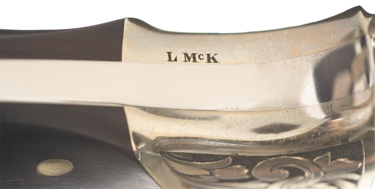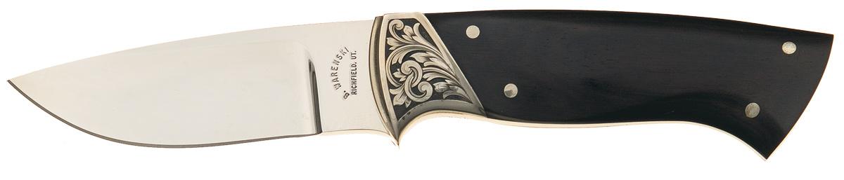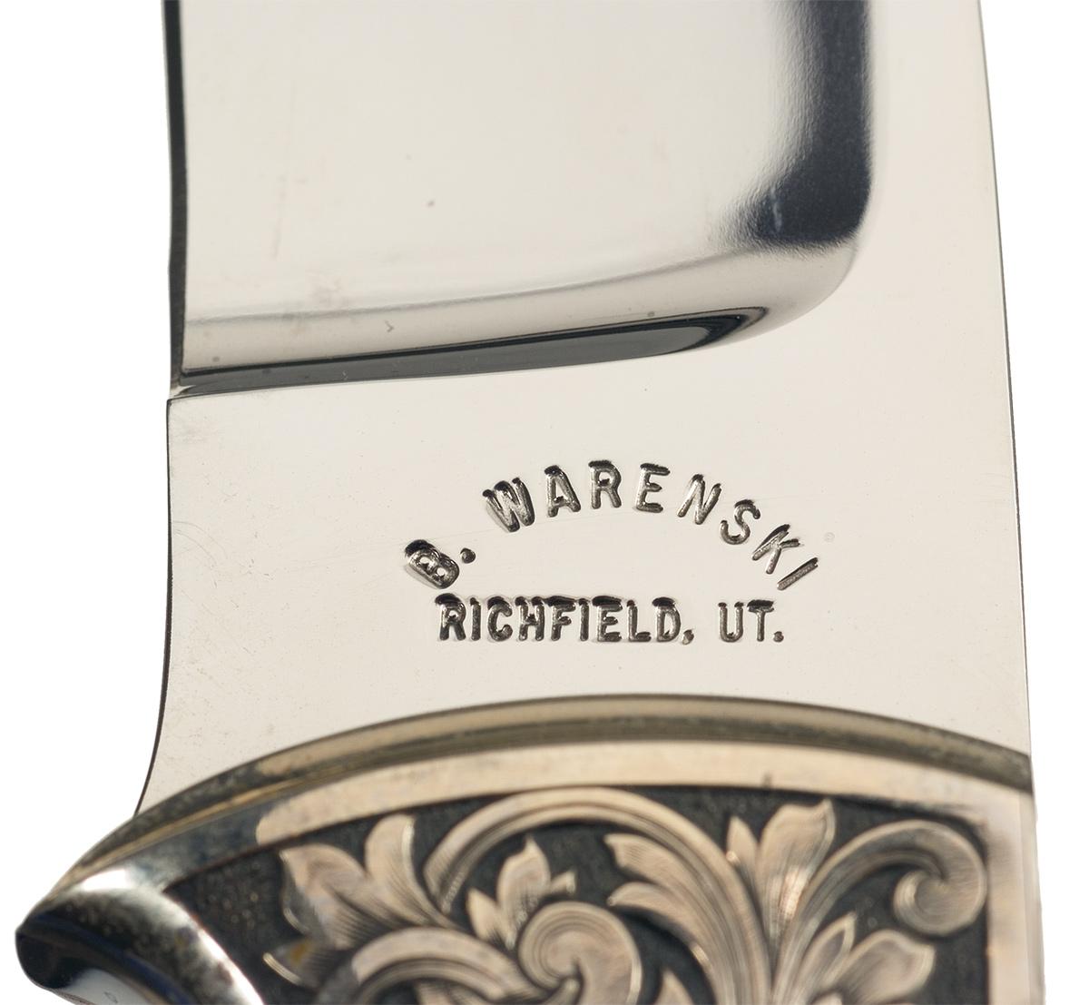 For those in the custom knife making industry Buster Warenski needs no introduction. He was one of the greatest knifemakers of the last century, creating some of the most sought-after and most expensive knives in the world. This Warenski knife features a 3 3/8 inch blade marked "B. WARENSKI / RICHFIELD, UT." The bolster has a floral scroll engraving on a back antiqued punch dot background and is signed by renowned engraver Lynton McKenzie: "L McK". The knife is fitted with nicely figured hardwood scales with four rivets. OAL: 7 3/4". Buster Warenski passed away on July 31, 2005.