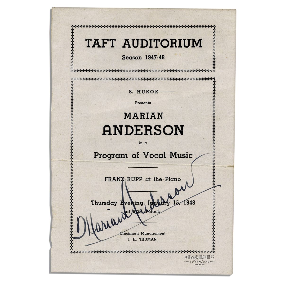 Program signed ''Marian Anderson'' in black ink, from the celebrated songbird's performance at Taft Auditorium on 15 January 1948. Single-page program is printed by Roessler Brothers printers. Measures 5.25'' x 7.5''. Horizontal crease with a small bit of separation at edge, else near fine condition.