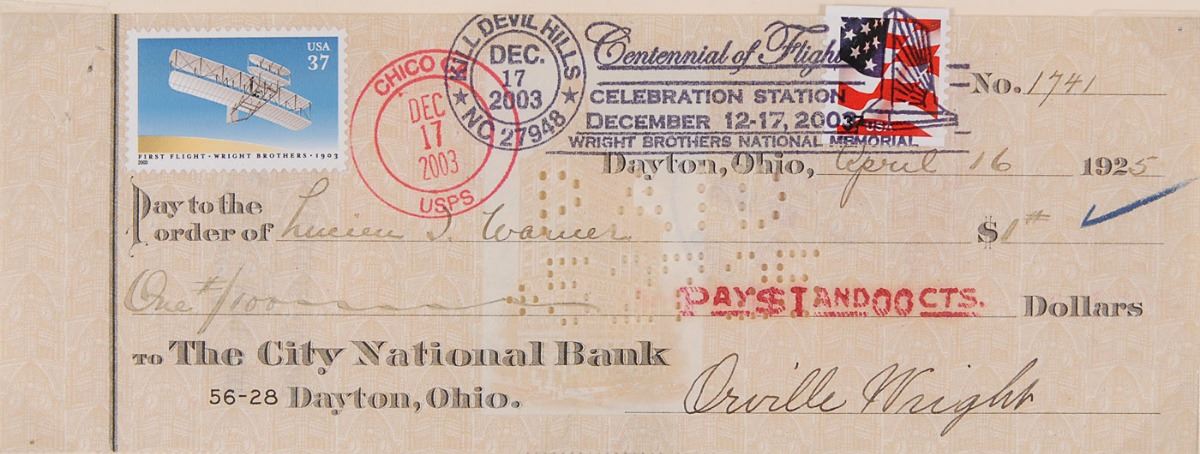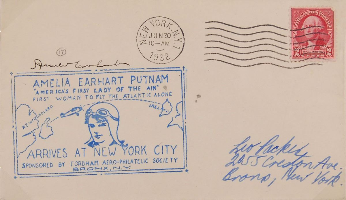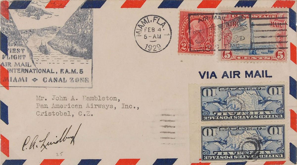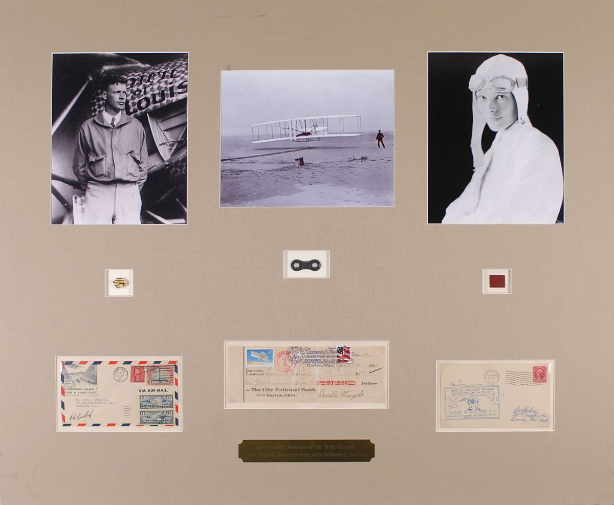 Impressive display featuring three famous aviators: an airmail cover postmarked Miami, February 4, 1929, with a stamped cachet honoring Lindbergh’s ‘First Flight Mail International F.A.M. 5 Miami–Canal Zone’ flight, signed in the lower left in fountain pen, “C. A. Lindbergh”; a bank check, 8.5 x 3.25, filled out in another hand and signed by Orville Wright, payable to Lucien Warner for $1, April 16, 1925, bearing commemorative 1932 and 2003 postmarks at the top; and a postal cover postmarked New York, June 20, 1932, with a stamped cachet honoring Amelia Earhart’s return to New York after her transatlantic flight, signed above the cachet in fountain pen by Earhart. Presented with a metallic propellor honoring Lindbergh; a drive chain representing the type used in the 1905 Wright Brothers’ engine; and a swatch of red fabric from Earhart’s Lockheed Vega 5B, removed from the plane while undergoing restoration at the Smithsonian. All are cloth-matted together with images to an overall size of 34 x 28. In overall fine condition. A wonderful, impressive assemblage of three of the greatest names in aviation history. Oversized.