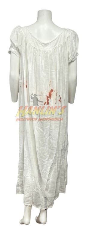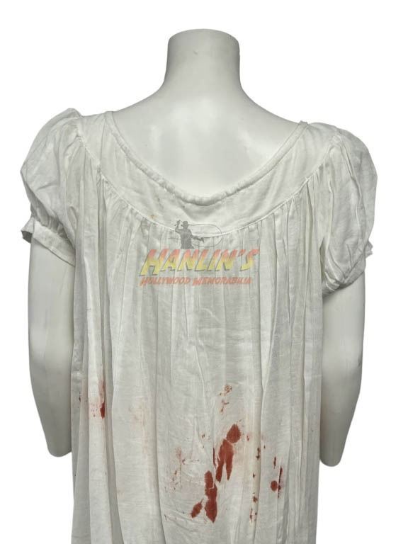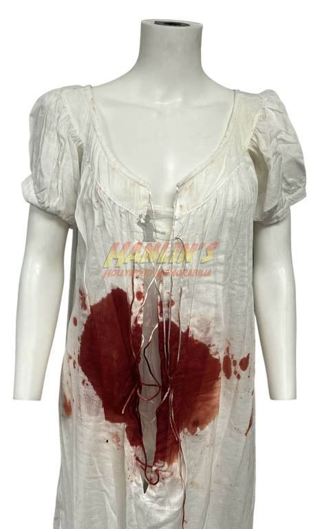 Original bloodied medical bay chemise worn by "Sara Lance", played by Caity Lotz in the production of the time travel superhero television show 'Legends of Tomorrow' (2016-2022), where time-traveling rogue Rip Hunter must recruit a ragtag team of heroes and villains to help prevent an apocalypse that could impact not only Earth, but all of time.