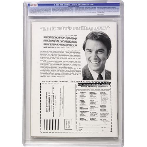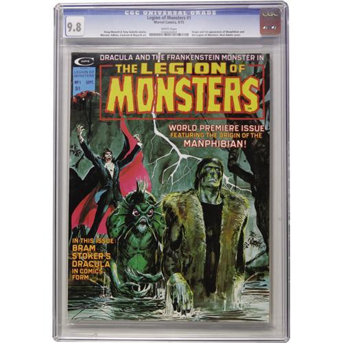 <B>Legion of Monsters #1 (Marvel, 1975) CGC NM/MT 9.8 White pages.</B></I> Neal Adams cover. Gray Morrow, Dan Adkins, Dave Cockrum, Val Mayerik, and Ralph Reese art. Dracula and Frankenstein's monster are featured. Note that a small plastic peg is loose inside the CGC holder, not affecting the integrity of the holder. Overstreet 2006 NM- 9.2 value = $45. CGC census 3/07: 2 in 9.8, none higher.<BR><BR><b>Shipping:</b> Comics - Slabbed (certified) (<a target="_blank" href="http://www.heritageauctions.com/common/shipping.php">view shipping information</a>)