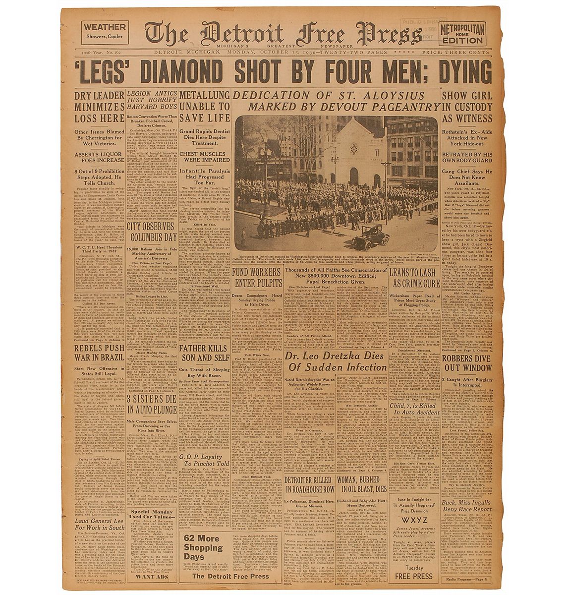 Original October 13, 1930, edition of The Detroit Free Press, 17 x 22.5, 22 pages, with the headline reading “’Legs’ Diamond Shot By Four Men; Dying,” and secondary headline and byline reading “Show Girl in Custody as Witness; Rothstein’s Ex-Aide Attacked in New York Hide-out. Betrayed by his own Bodyguard.” In very good fragile condition, with central horizontal fold, uniform toning, and some light chipping and paper loss to edges. Diamond had been lured to a hotel in New York by a Ziegfeld girl, and ambushed by Dutch Schultz’s men, but escaped with only minor wounds.