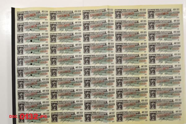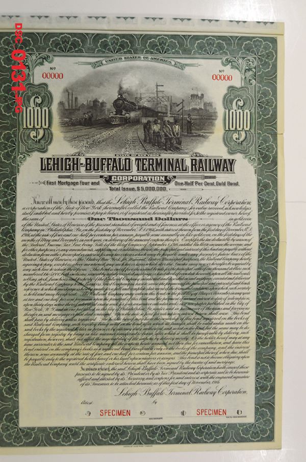 New York. $1000 Specimen 4 1/2% 1st Mortgage Gold Coupon Bond, Black print on green border and under tint, Image of men carrying railroad tie with oncoming train approaching, Specimen overprints and POC's, Fine-VF condition with splitting along fold lines, ABNC.