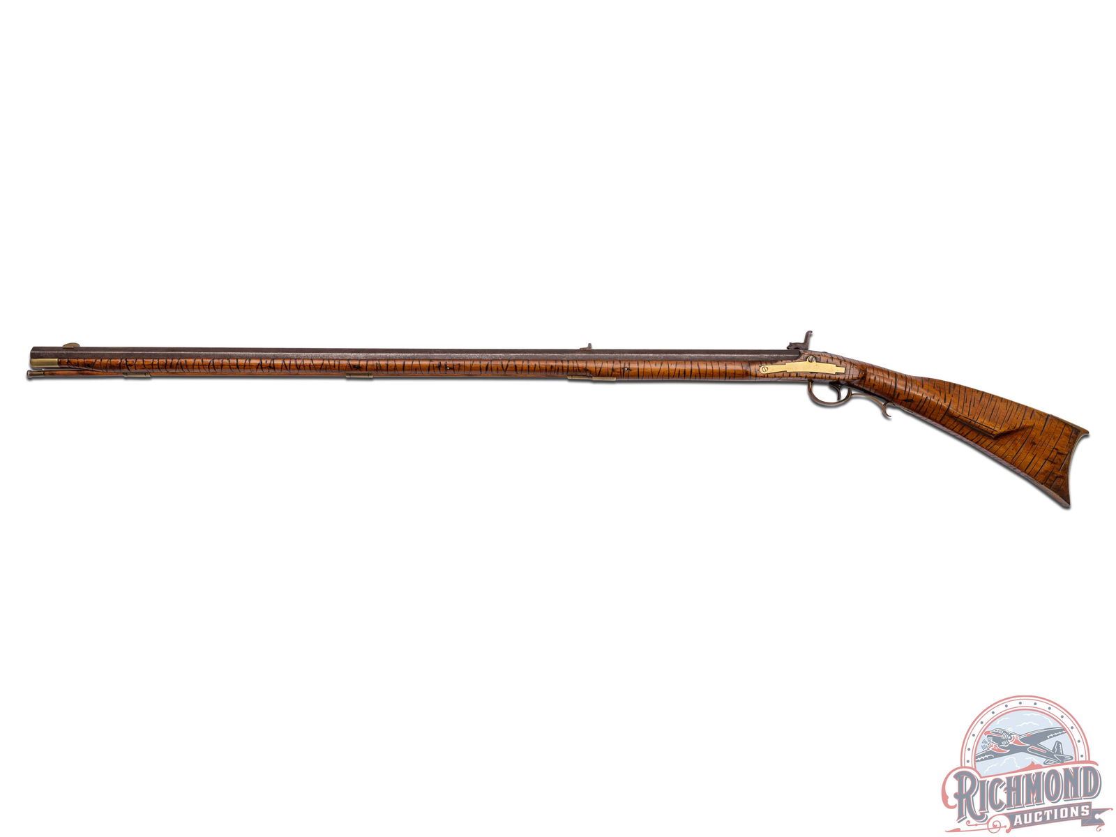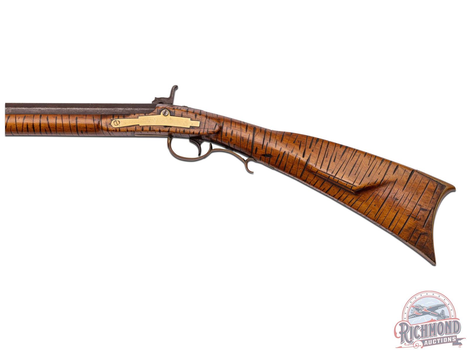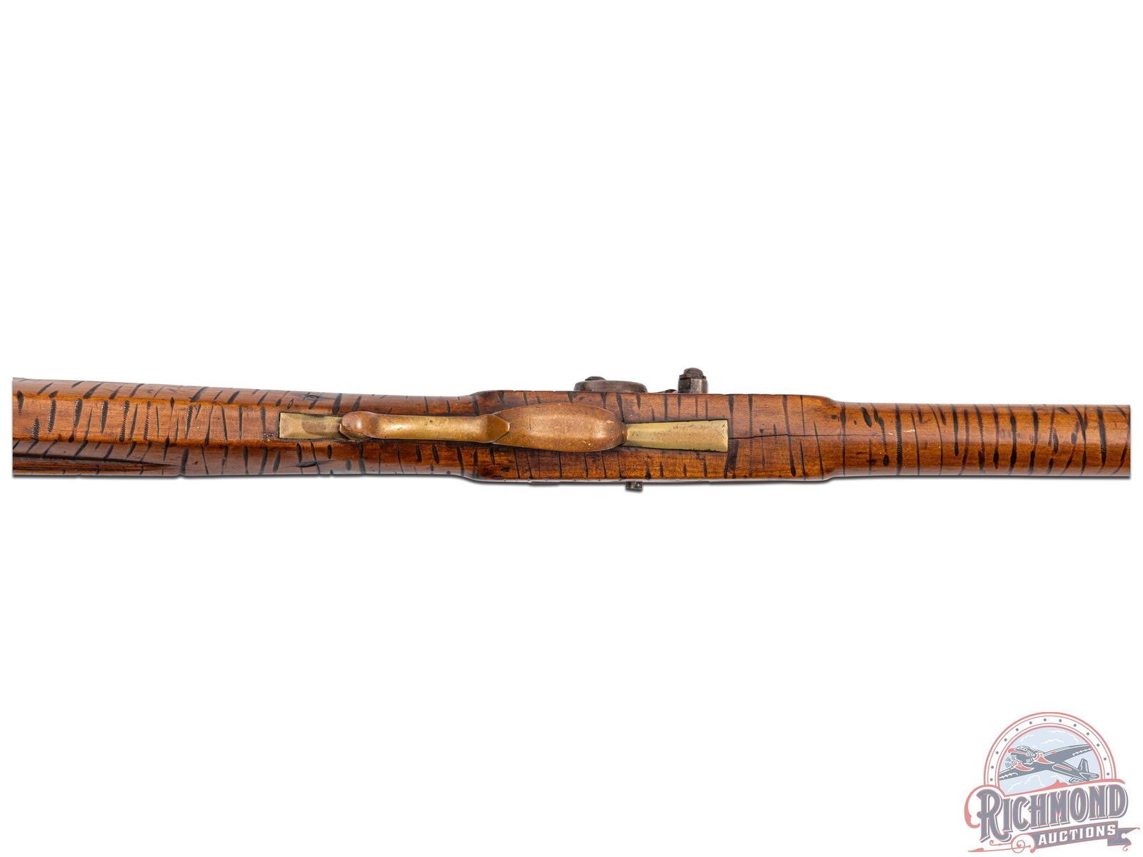 Percussion Kentucky rifle attributed to the Lehigh County area of Pennsylvania, circa 1850. Rifle measures 53-1/2" overall with a 38-1/2 " octagon 45 caliber smoothbore barrel. Barrel is unmarked with rifle sights. Rifle has a George Golcher marked percussion lock with single trigger control. Full plain maple stock with unique "Gouge" type decoration that appears to be done to simulate curly maple striping. Stock has brass hardware including two piece brass patchbox with release in butt. Comes with striped hardwood ramrod with gunsmith made worm attachment. CALIBER: 45. FFL STATUS: Antique.