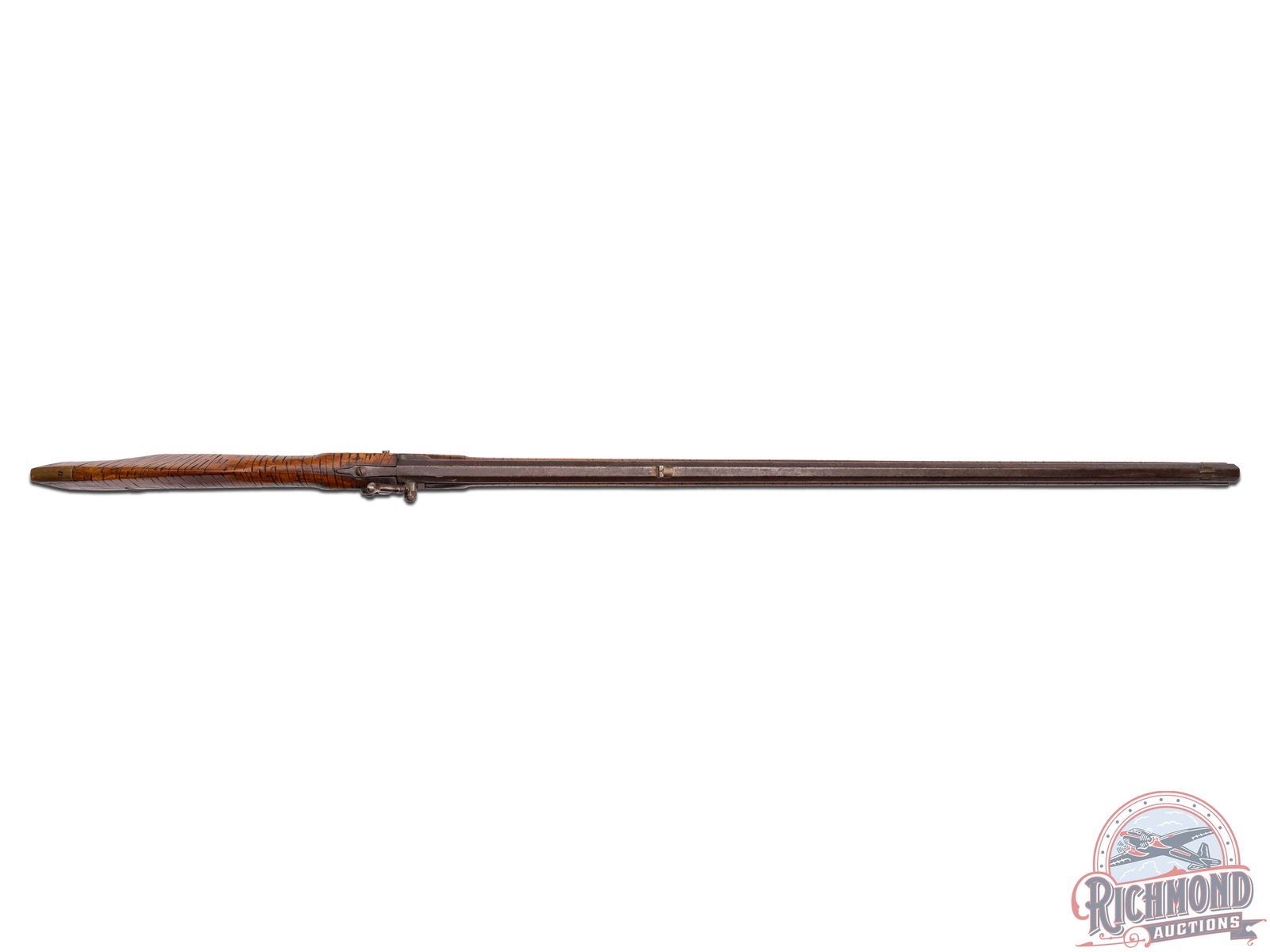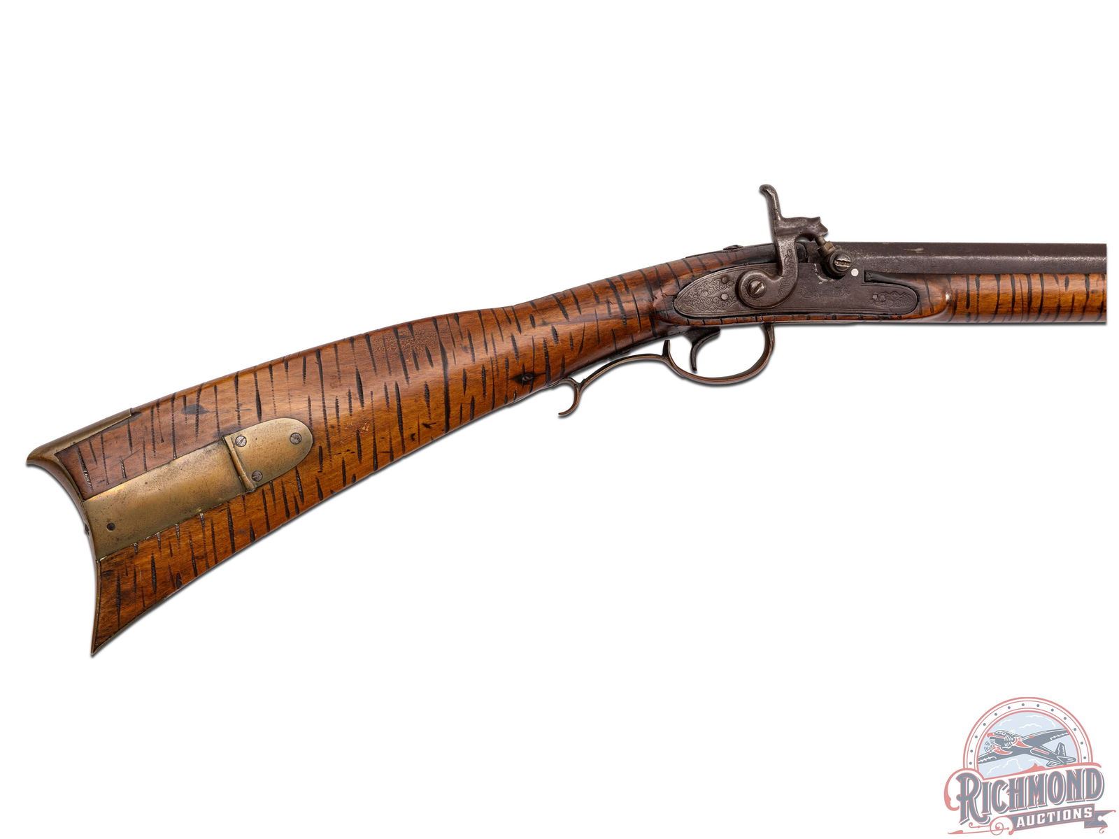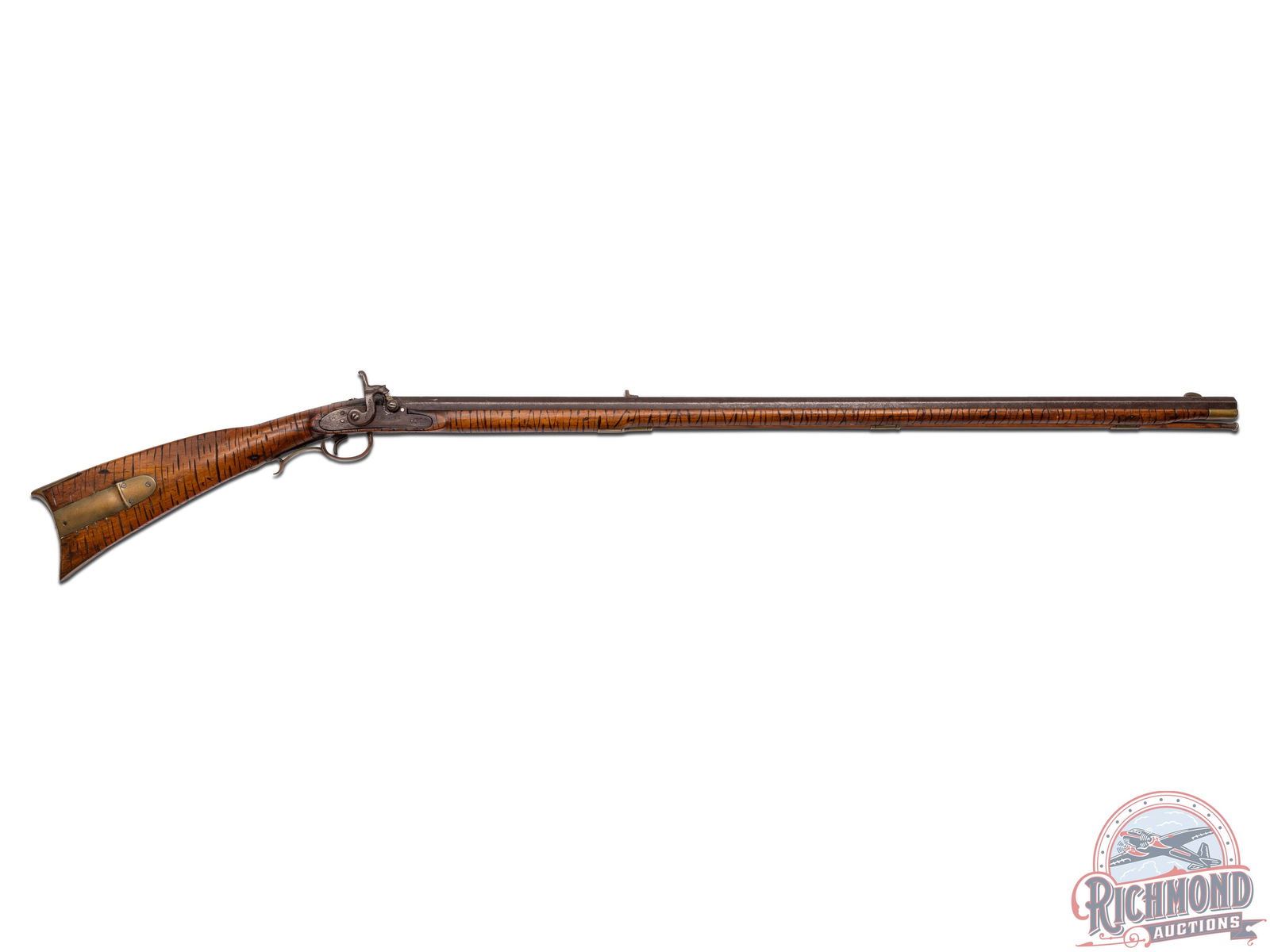 Percussion Kentucky rifle attributed to the Lehigh County area of Pennsylvania, circa 1850. Rifle measures 53-1/2" overall with a 38-1/2 " octagon 45 caliber smoothbore barrel. Barrel is unmarked with rifle sights. Rifle has a George Golcher marked percussion lock with single trigger control. Full plain maple stock with unique "Gouge" type decoration that appears to be done to simulate curly maple striping. Stock has brass hardware including two piece brass patchbox with release in butt. Comes with striped hardwood ramrod with gunsmith made worm attachment. CALIBER: 45. FFL STATUS: Antique.
