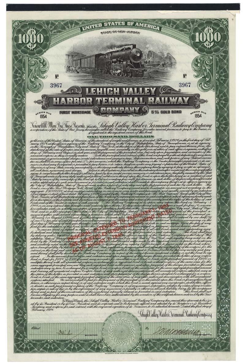 1925, New Jersey. Bond for $1000 bearing 5% interest. Green/Black. Vignette at top center of steam locomotive at station. Perferation cancelled. Very fine.