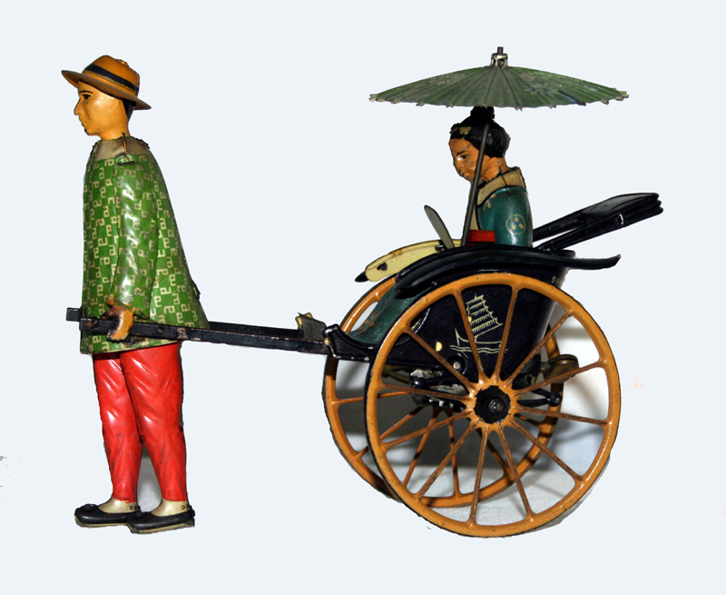 Toy rickshaw occupied by stylish lady being pulled by coolie. Key wind. Working condition. As toy moves across the floor, lady fans herself. Marked “Masuyama” on back. Made in Germany 773. Good paint with slight fading commensurate with age.
