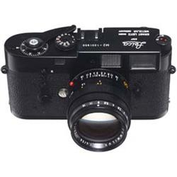 Leitz, Wetzlar, Nr. 1.031.951, schwarz, Kamera in hervorragendem Originalzustand! Fehlerfreies Stück. Mit "Summilux 1,4/50", Nr. 3.340.770, schwarz eloxiert. Black M2 camera, in excellent original condition. With Summilux lens, anodized. - (2/2+) - € 2.500/3.000 - (148/153)