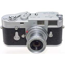 Leitz, Wetzlar, Nr. 1.099.489, "Elmar 2,8/5 cm", Nr. 1.620.894, versenkbar, mit Deckel und Tasche. Delle über dem Suchereinblick, Objektiv mit Putzspuren. Leica M2 with collapsible Elmar 2,8/5 cm, lens with scratches, dent above the finder. With lens cap and maker's case. - (3-/3-) - € 400/600 - (142/5)