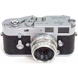 € 420,- Leitz, Wetzlar, Nr. 1.091.826, Delle im Bereich des Aufzugshebels, sonst geringe bis normale Gebrauchsspuren, (3-/2). "Summaron 2,8/35", Nr. 2.101.394, (3-/3+). Single-wind Leica M2, dent beside the transportation lever, normal signs of use. Summaron 35 mm lens! - € 700/900 - (153/1)