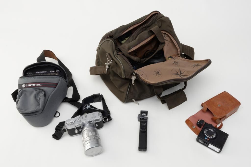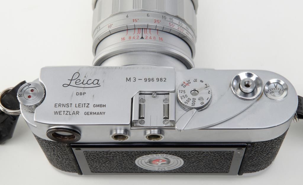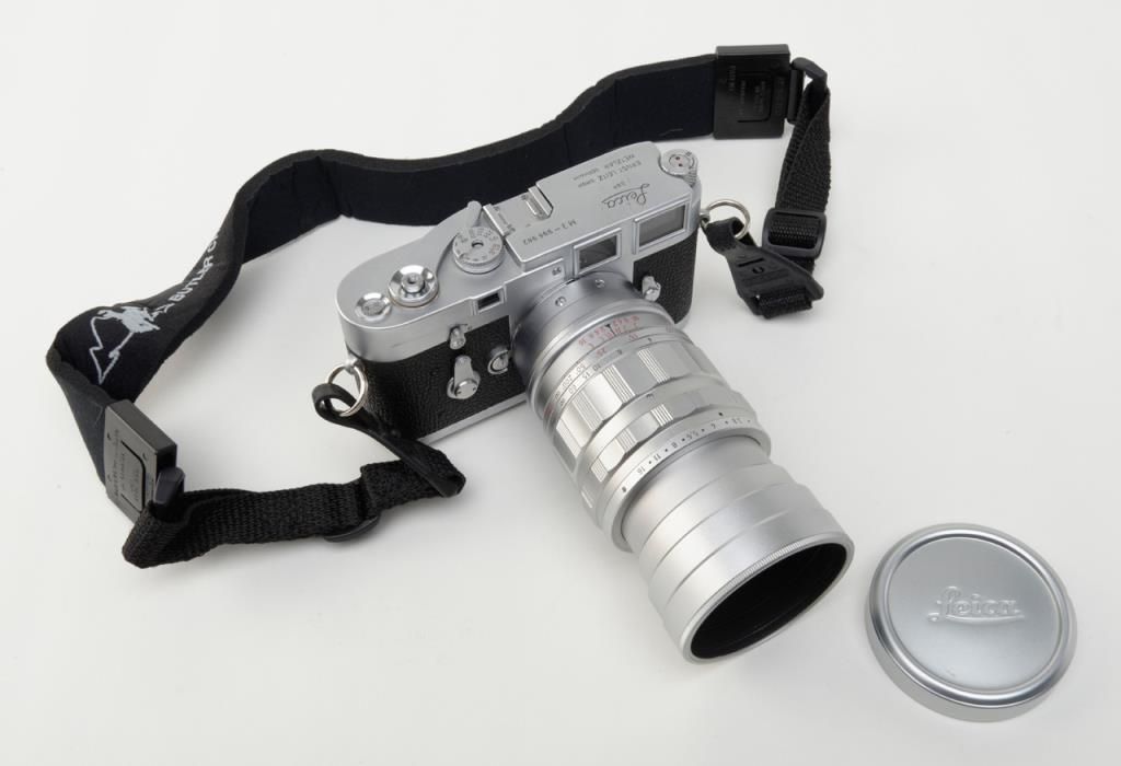 Leica M3 film camera with Leitz Summicron 1 : 2 / 90 lens, soft carry case, instructions and additional shoulder bag containing small Tasco 4m tripod and a Nikon SB-10 Speedlight with softcase and instructions. The camera and flash attachment are in unknown working condition. Est.: $150-$300.
