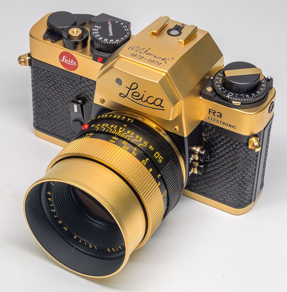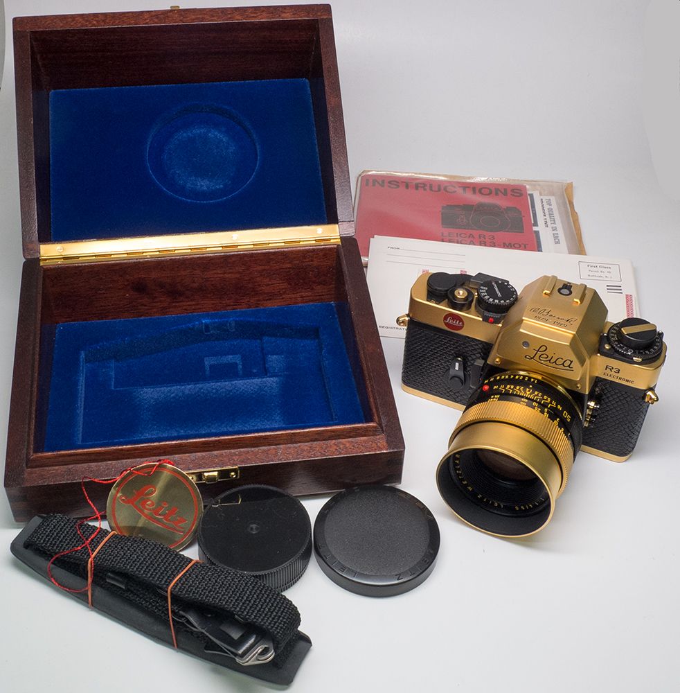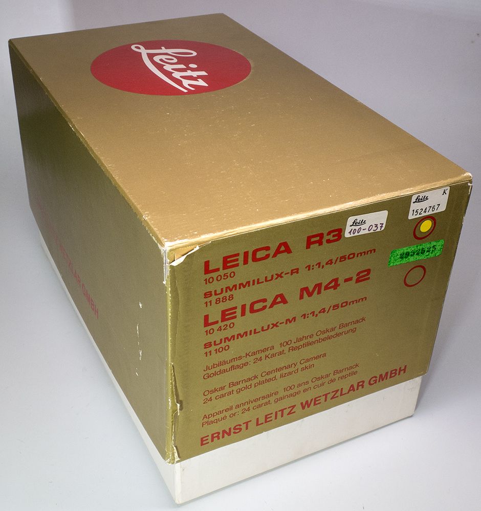 1979 This fabulous lot contains a complete Leica R3 GMBH camera, lens & caps, manual and warranties, and every other item that came with this limited edition camera, inside the oiriginal box. This particular camara, serial #1524767, is the special Oskar Barnack 100th Anniversary model, with 1.4/50mm lens. The camera body and the matching lens are 24K gold plated. The body has black lizard skin covering its surfaces. Only 1000 were ever produced. The top of the prism housing has Barnack's signature, and the dates 1879-1979. The camera & lens come in a special brass-trimmed velvet-lined walnut gift box. Even the original packing box has the protective foam padding, just as it came from the Leica factory. It is in nearly flawless condition, and looks like it was never used. A truly magnificent find for the collector. - HKA#66011