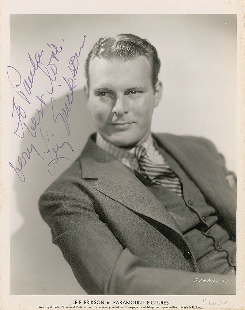 Pearl-finish 8 x 10 Paramount Pictures double-weight publicity photo, signed and inscribed in black felt tip to Movie Star News’s Paula Klaw, “To Paula, very best love, Leif Erikson.” Some scattered light surface marks and creases and an ink notation to bottom border, otherwise fine condition.