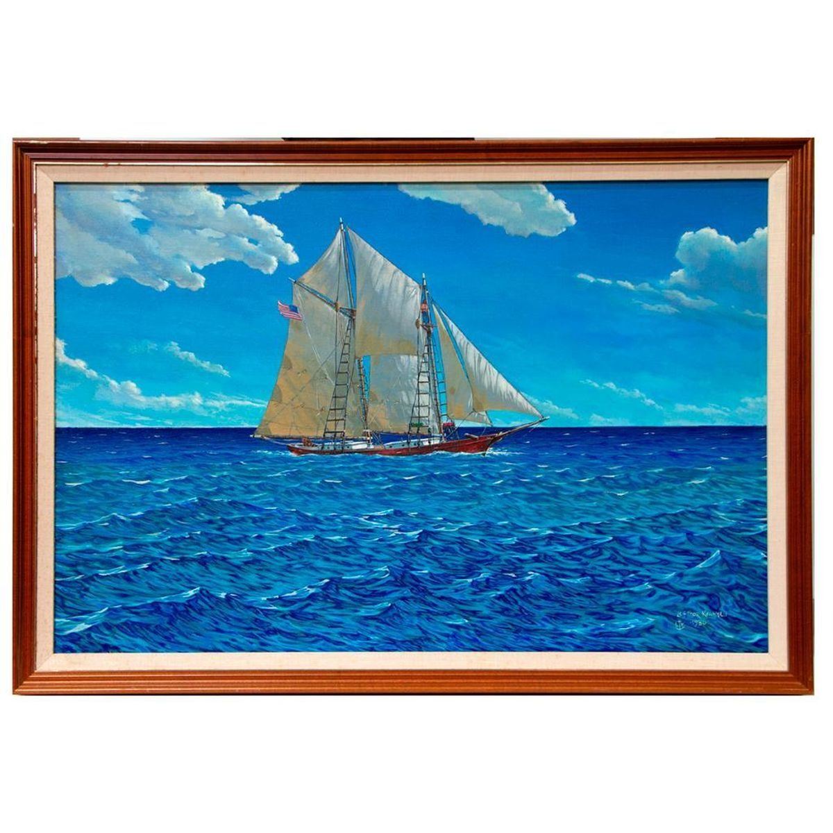 Artist: Leifthor Krammen. Title/Subject: Under full sail. Signature:Lower right. Medium: Oil on canvas. Size image: 24" x 36" Size frame: 28" x 40" Created: 1986. Condition: Good.