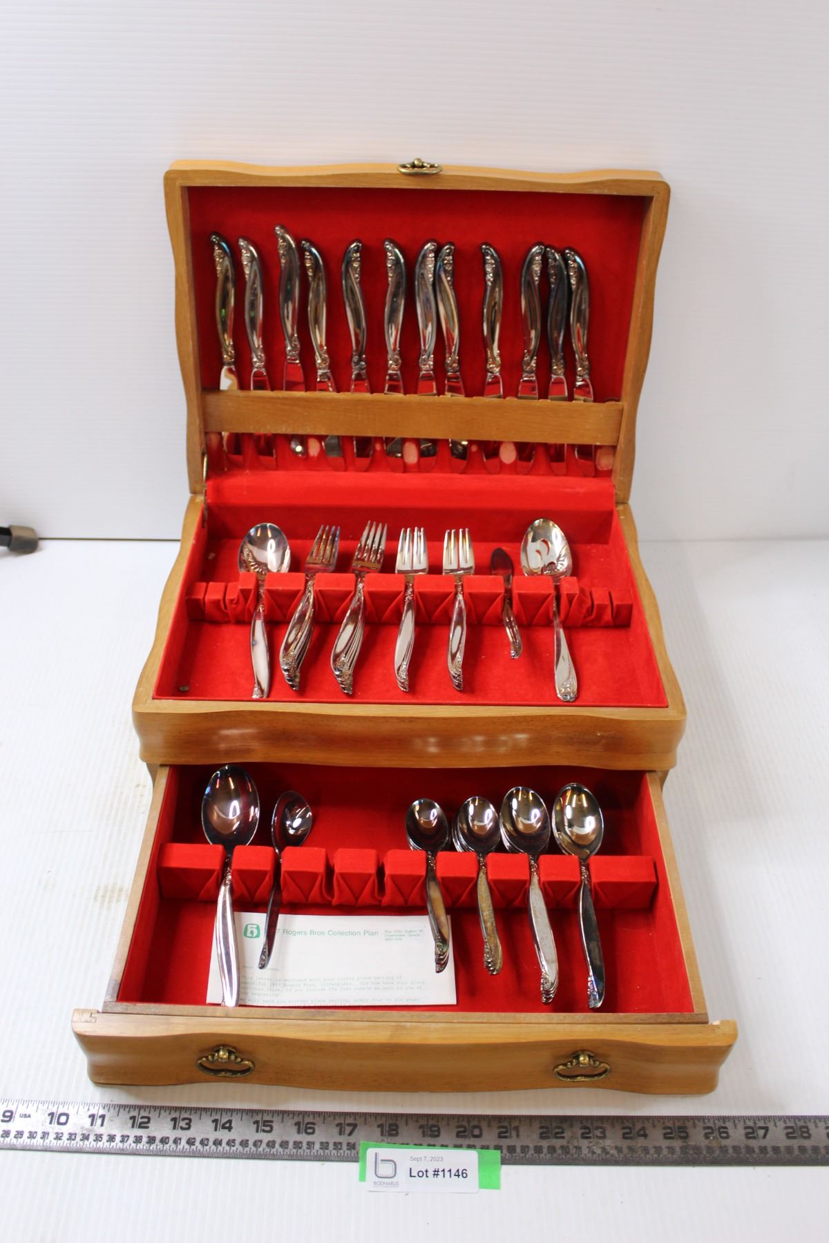 "Leilani" Silver Plate Pattern 1847 Roger Bros IS 1961 67pc Set in Wood Chest- Incomplete