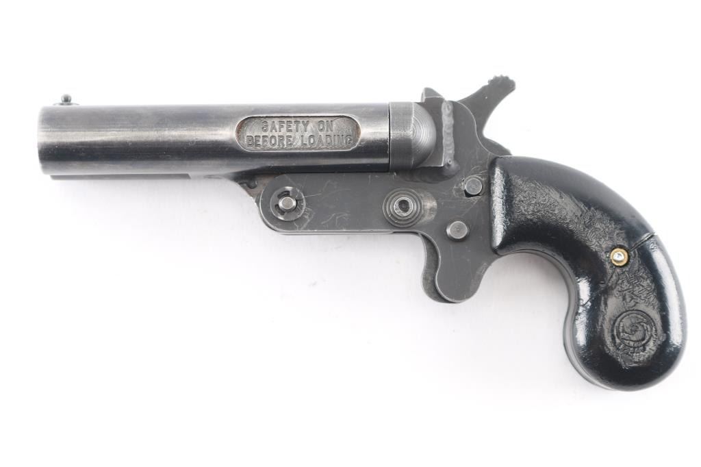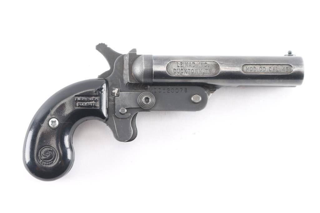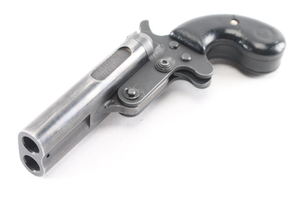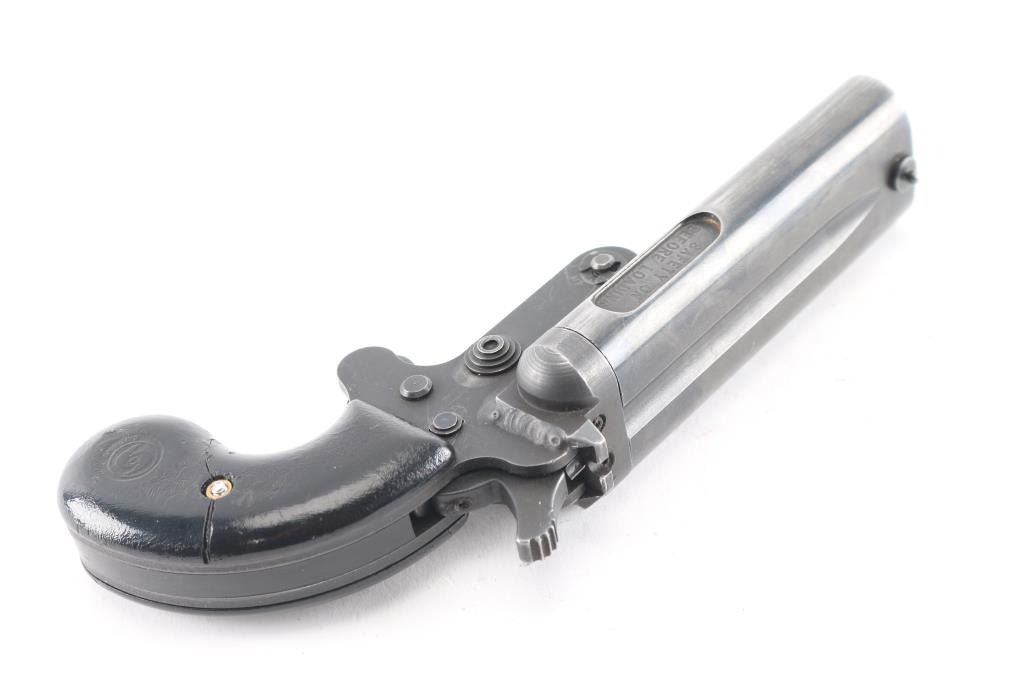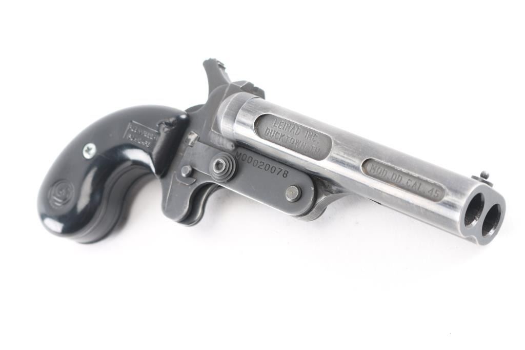 serial #M00020078, 45 Colt / 410 Bore, 3 3/4” barrels. The metal surfaces retain about 85% original Parkerized finish with handling wear to the barrels, minor scratches. The lightly textured synthetic factory grips have the Cobray logo molded into each panel, the left panel has a repaired crack. This pistol features a manual cross-bolt safety, pivoting barrel selector on the single center hammer, bead front sight and fixed rear sight.