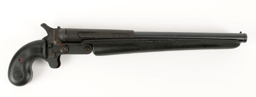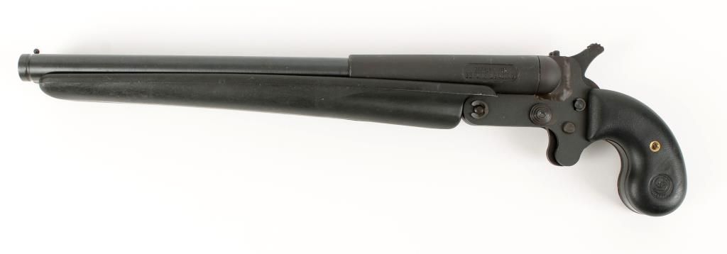 Break action SXS pistol chambered in .45 caliber, 3 3/4" barrels, spur trigger, barrel selector switch, black plastic grips and forearm. Excellent condition.